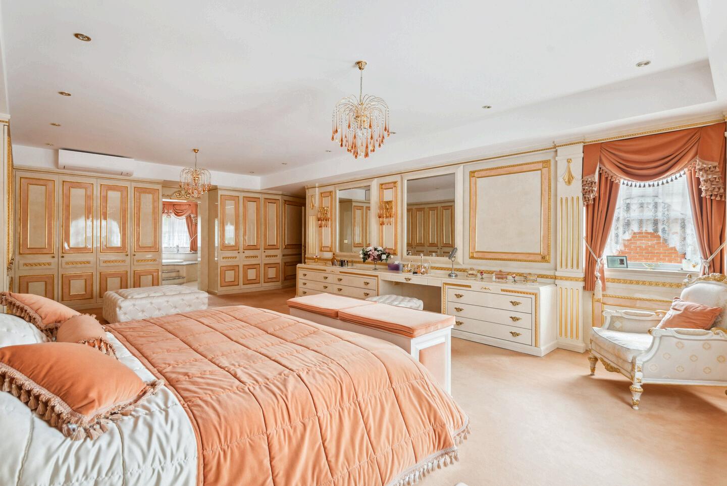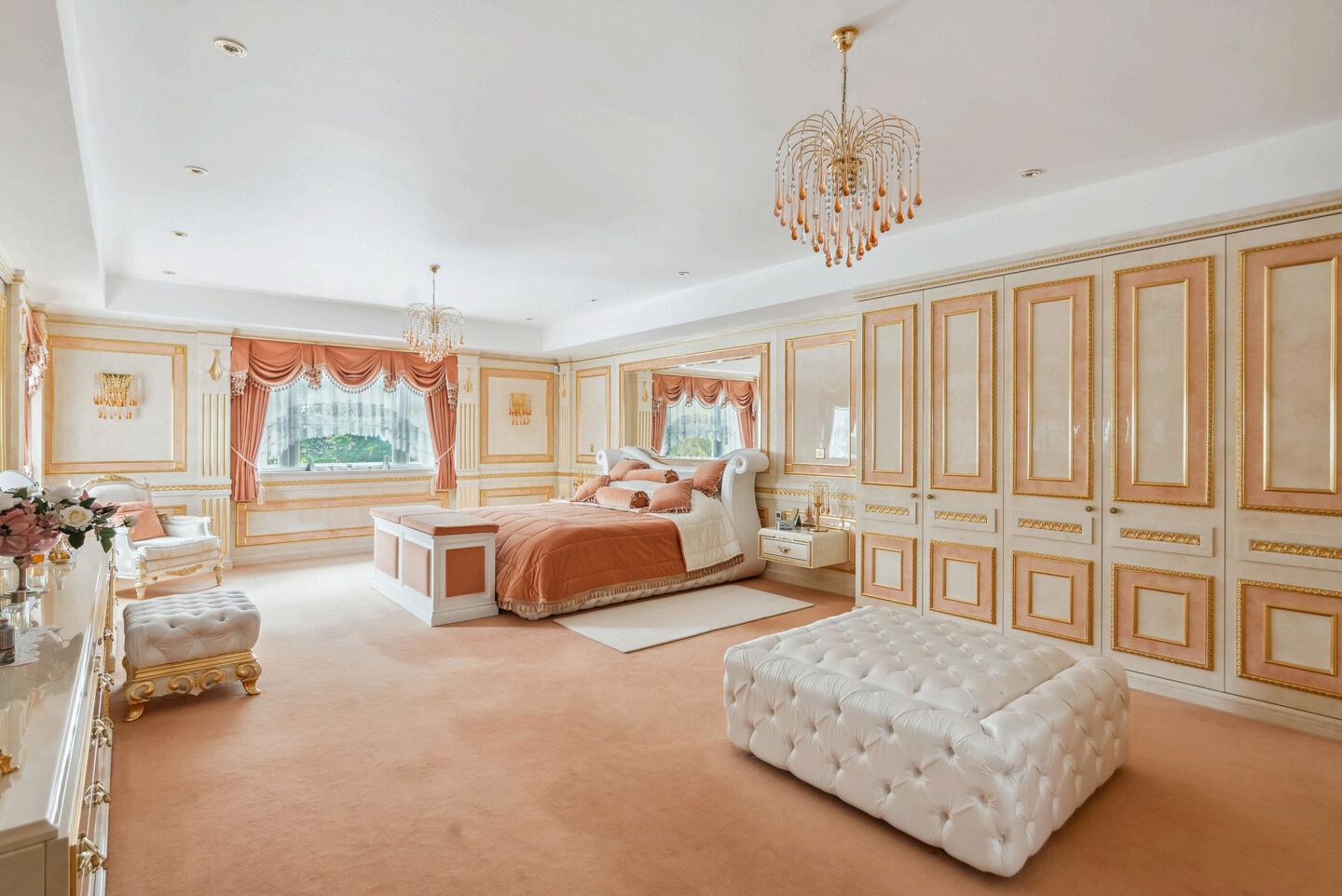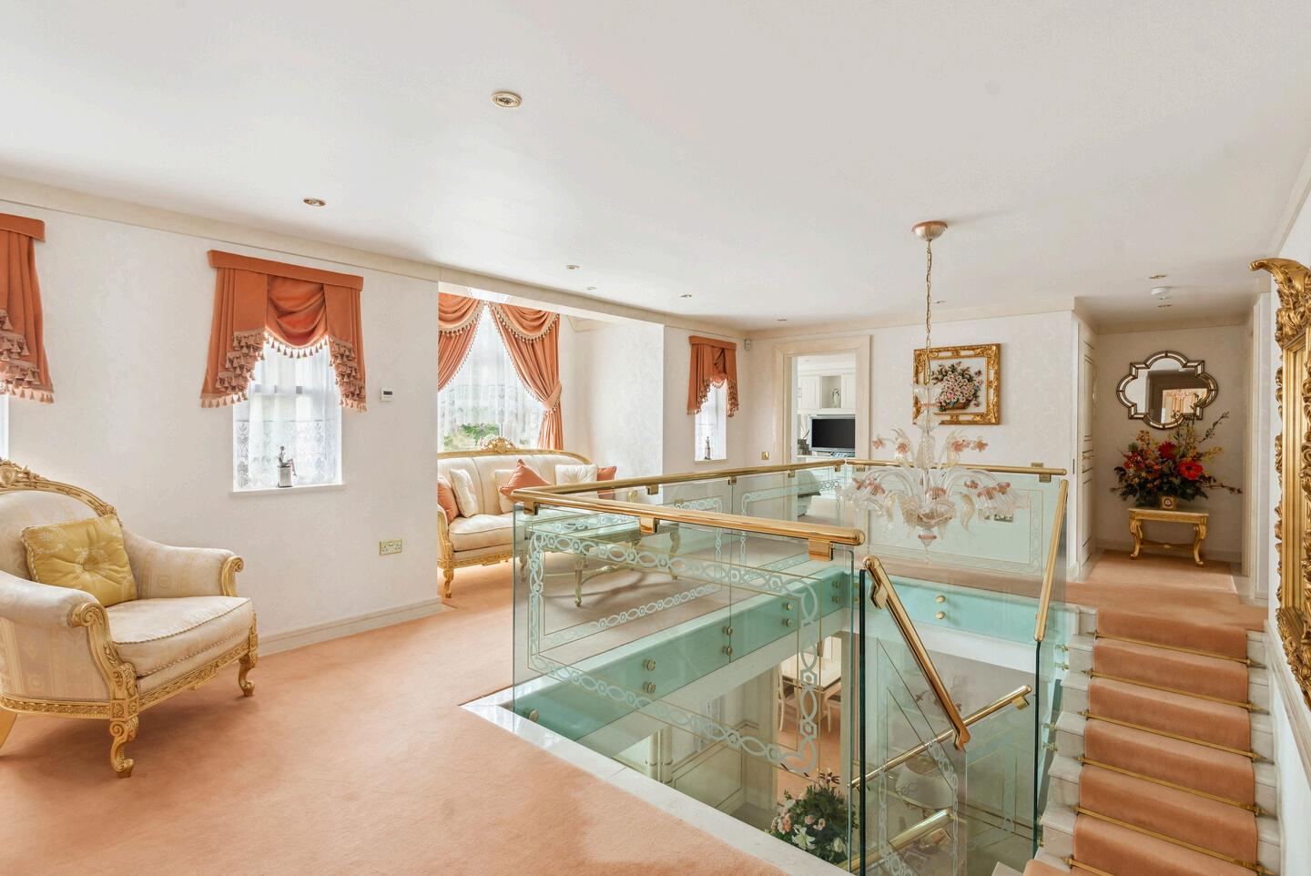 Meticulously designed by the current owners this expansive home totals 8,300 sq ft of exquisite living. Hidden behind the electric gates the driveway accommodates up to 5-6 cars and provides access to the large double garage. At the heart of the house sits a bifurcated staircase created from Carrara marble imported from Tuscany which leads to a grand landing that accesses the numerous bedrooms and bathrooms. Carefully designed and constructed, the current owners also installed a lift that access all three floors, imported from Italy.