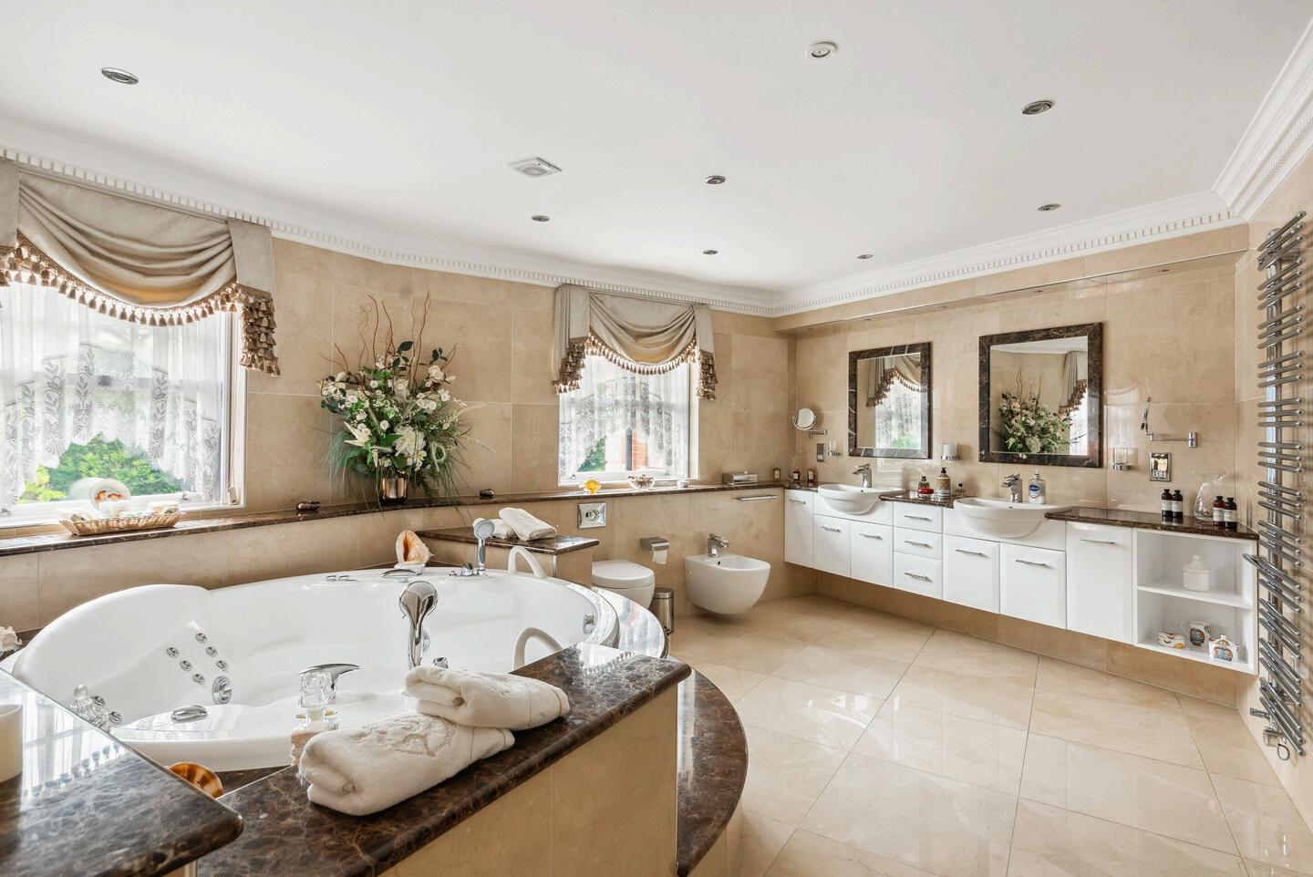 The first floor provides access to 4 of the 5 bedrooms, all with their own individually designed en-suites with a plethora of marble. The principle suite exudes opulence totalling almost 30 ft in length, ample storage and dressing area, with access to an all marble ensuite with jacuzzi style pool and his and hers showers and toilets.