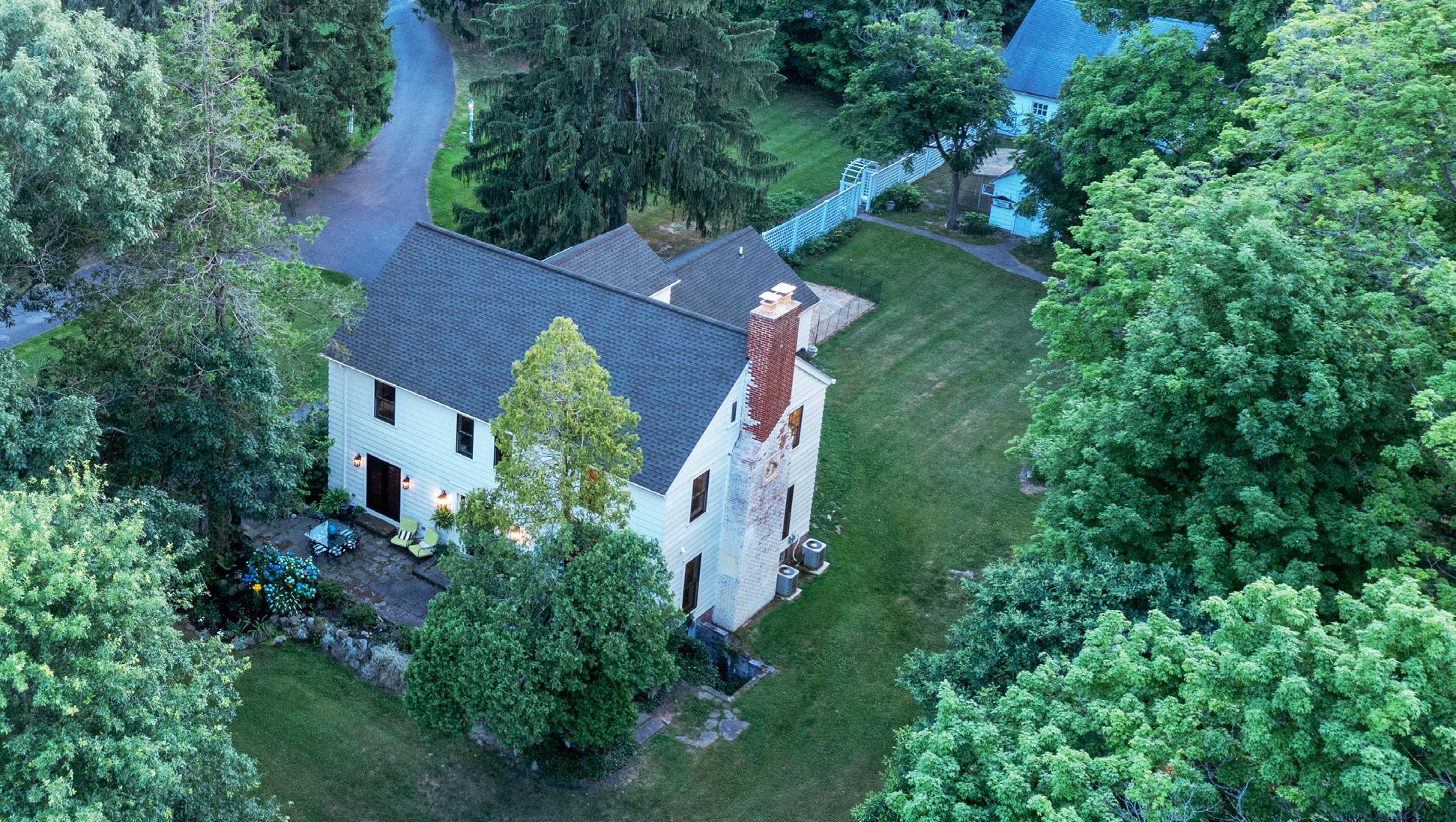 The estate’s grounds are a verdant oasis, complete with 1,000 feet of 100-year-old Concord grape vineyards, a heritage apple orchard, peach and fruit-bearing chestnut trees, carefully cultivated hedges, stone walls, walkways, and extensive perennial gardens. The property also includes a pond, a greenhouse, a chicken coop and a two-story workshop and twostory three-car equipment garage.