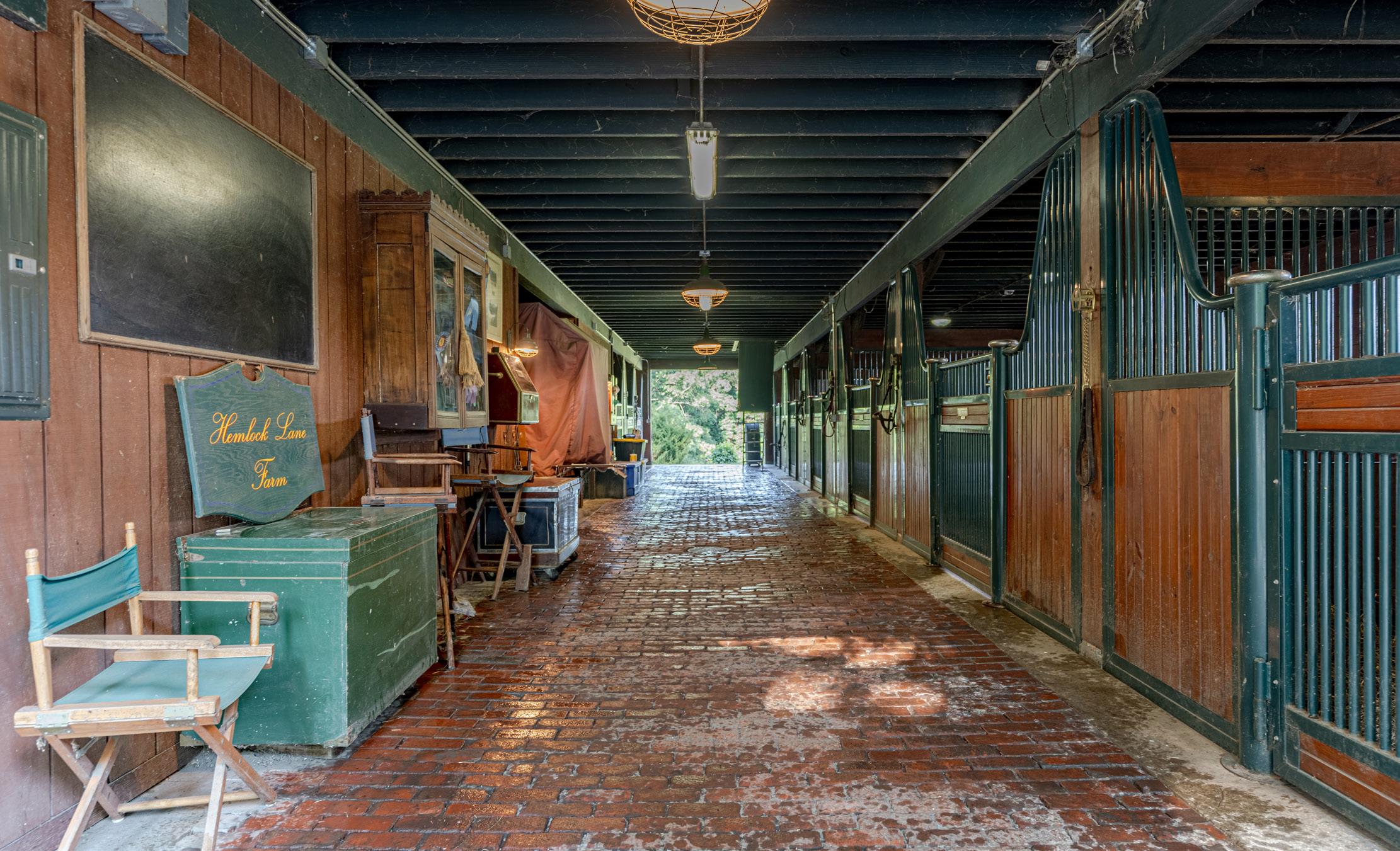 The professional equestrian facilities feature a 9-stall horse stable with reclaimed brick floors. Radiant heated floors keep the wash stall, designer tack room, and attached 8-run heated dog kennel comfortable in all seasons.