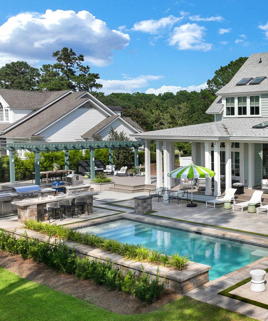 Cooking and entertaining outdoors is a dream thanks to the state-of-the-art summer kitchen. This fully equipped outdoor kitchen features multiple grilling stations and cooking appliances – including a built-in gas grill, gas griddle, smoker, and even a pizza oven – allowing for everything from casual barbecues to gourmet meals dining al fresco. Nearby, an expansive pergola with a designer dining set provides a shaded spot to enjoy meals and cocktails, complete with an al fresco media setup (outdoor TV lift cabinet) and integrated LED lighting for evening ambiance. Whether hosting a lively party or enjoying a quiet afternoon by the pool, every inch of this outdoor oasis has been optimized for leisure and entertainment. From the travertine patio to the comfortable lounge areas, it’s an entertainer’s haven designed to make the most of Bluffton’s year-round outdoor lifestyle.