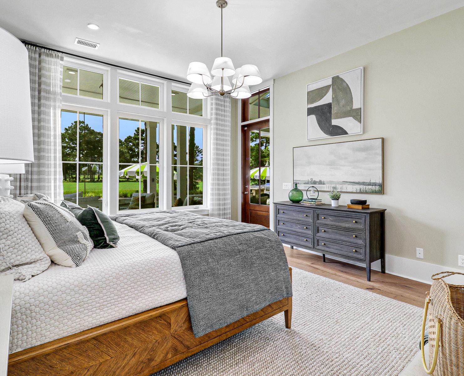 The home offers three generous bedroom suites, including a luxurious primary suite on the main level. The primary bedroom is a private retreat unto itself, featuring ample natural light, a spa-like ensuite bath, and even French doors to a secluded porch – perfect for morning coffee amid tranquil views. Upstairs, two well-appointed guest bedrooms each boast their own ensuite bathrooms, providing comfort and privacy for family and visitors. An open loft lounge on the upper level creates an additional gathering space – ideal as a game room, media den, or casual living area for grandchildren and guests to relax. Throughout the interior, bespoke design touches by Brian Patrick Flynn lend a cohesive sense of style, from designer light fixtures and statement wall coverings to the artful mix of coastal hues and textures that evoke a sophisticated Lowcountry vibe.