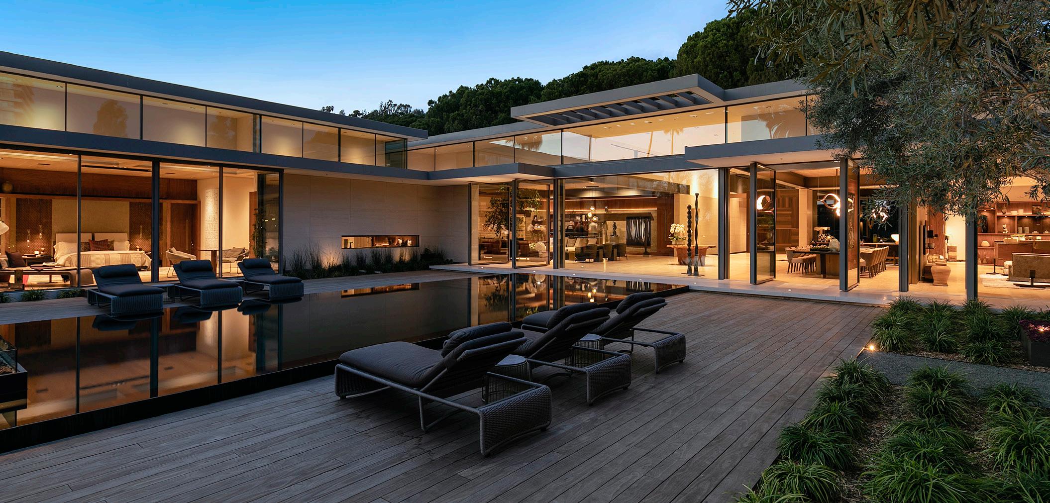 The front door is a 13’ wide, solid steel-reinforced structure made of texturized Eucalyptus with integrated brass details and a brass and green onyx handle