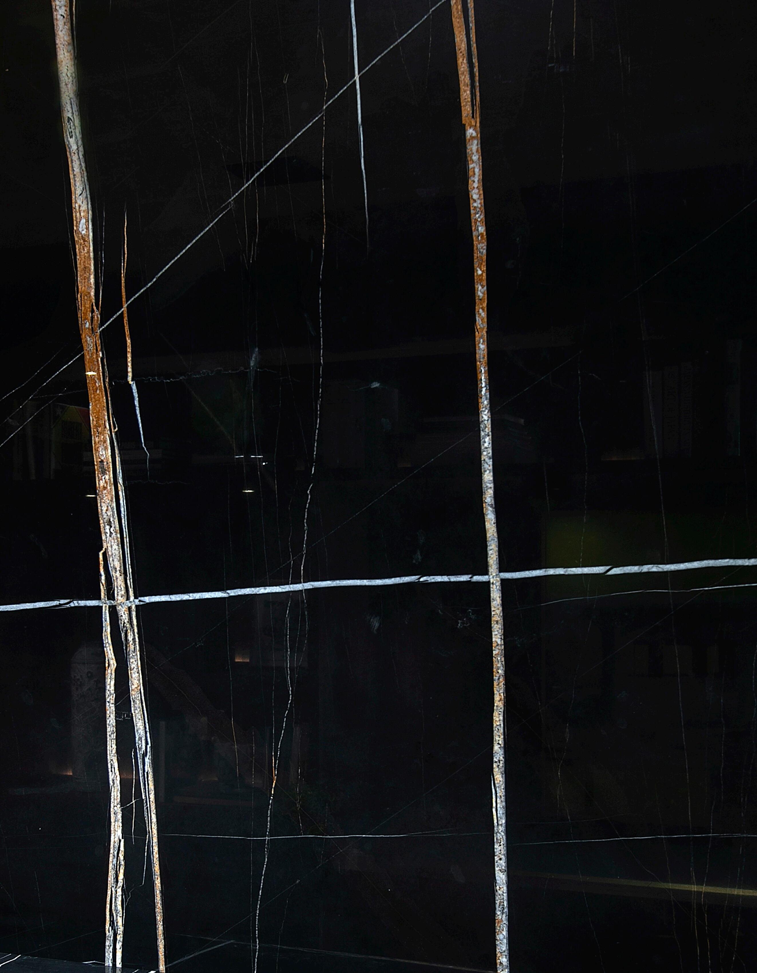 Main Powder Room floors are in Vermont Black honed stone slabs and sink enclosure is made entirely of Carnico gray marble, hand-painted walls with storage niches, 24k gold Graff faucet, and brass towel holders