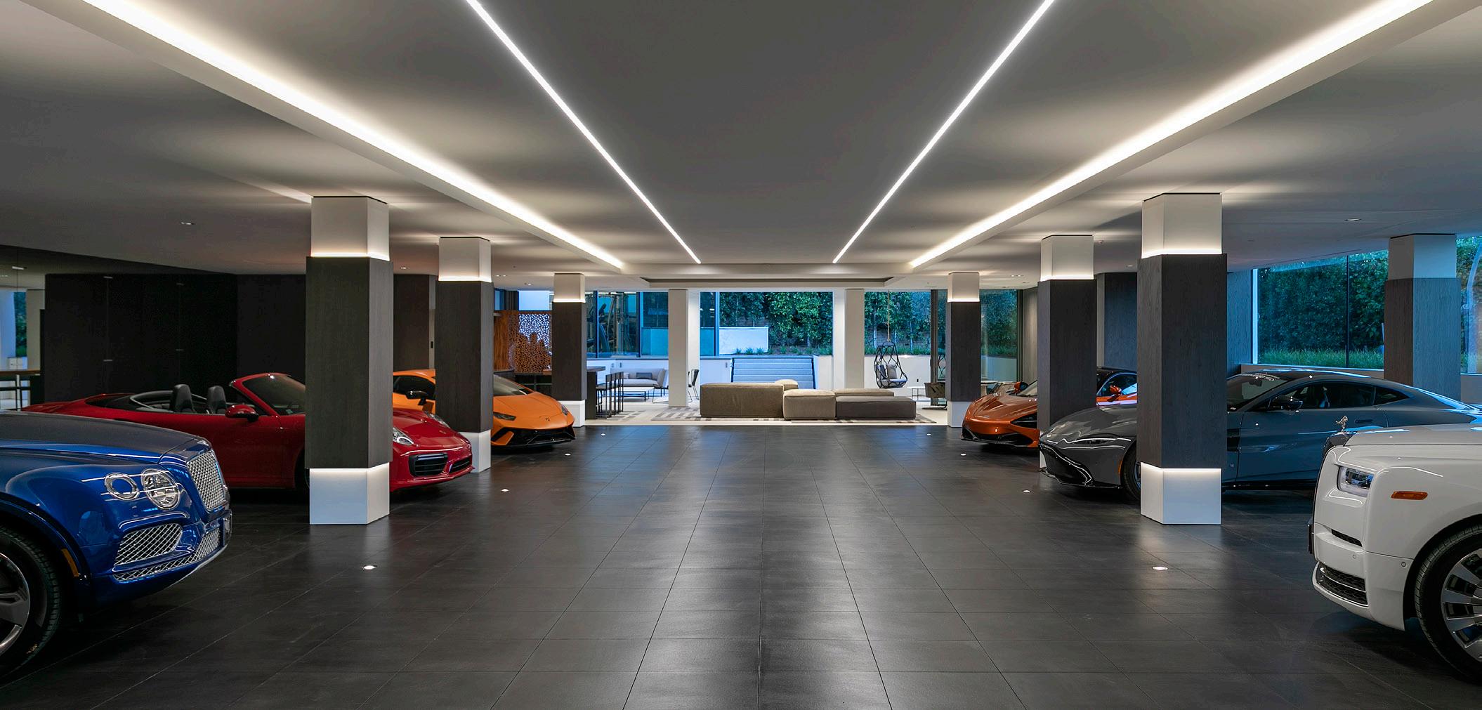 Entertaining space and view to car gallery with two half-bathrooms and one adjacent exterior bathroom