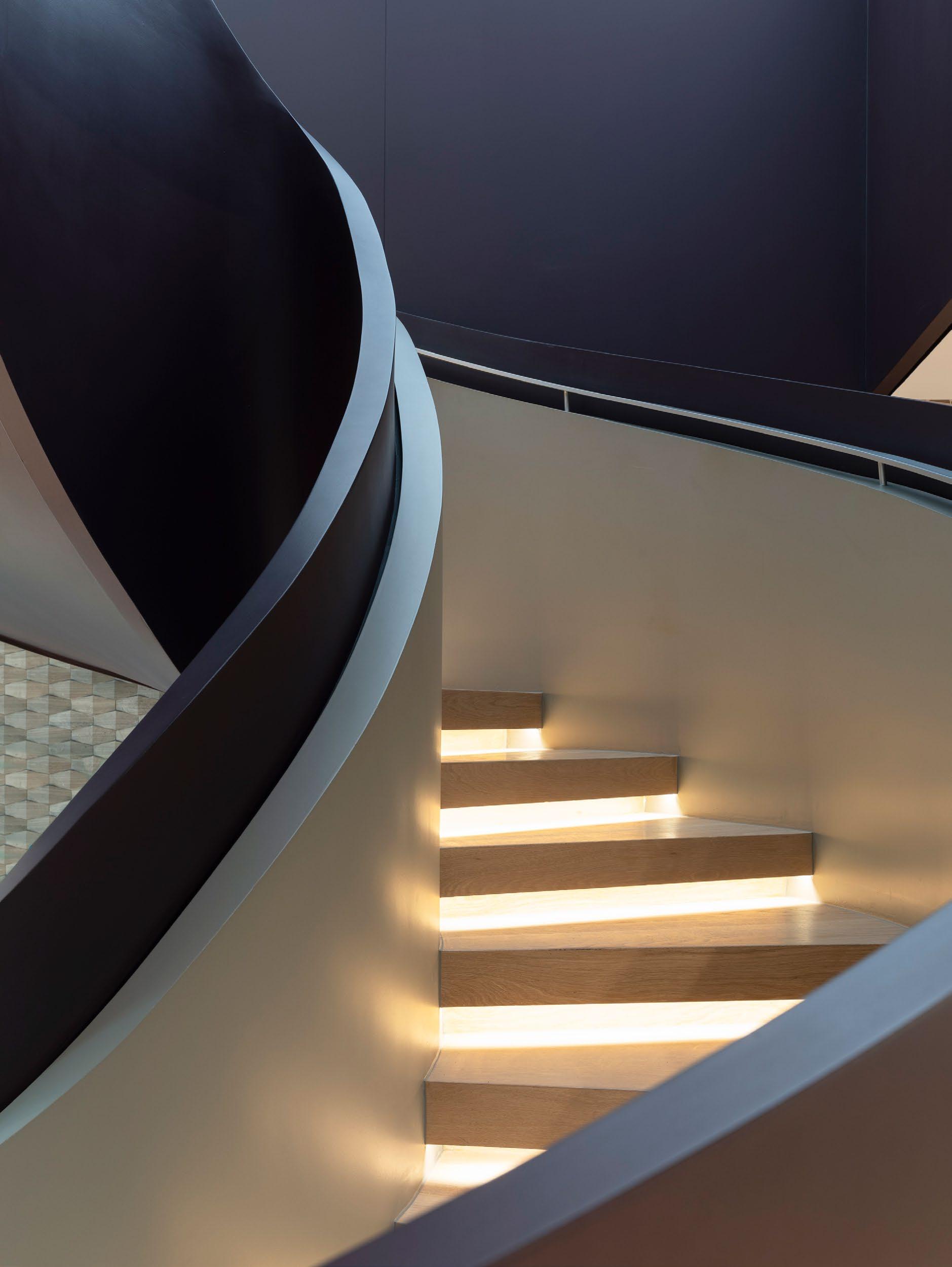Exposed steel beams, French white oak floors and texturized walnut and brass details exude sophistication, while clerestory windows bathe the interiors in light.