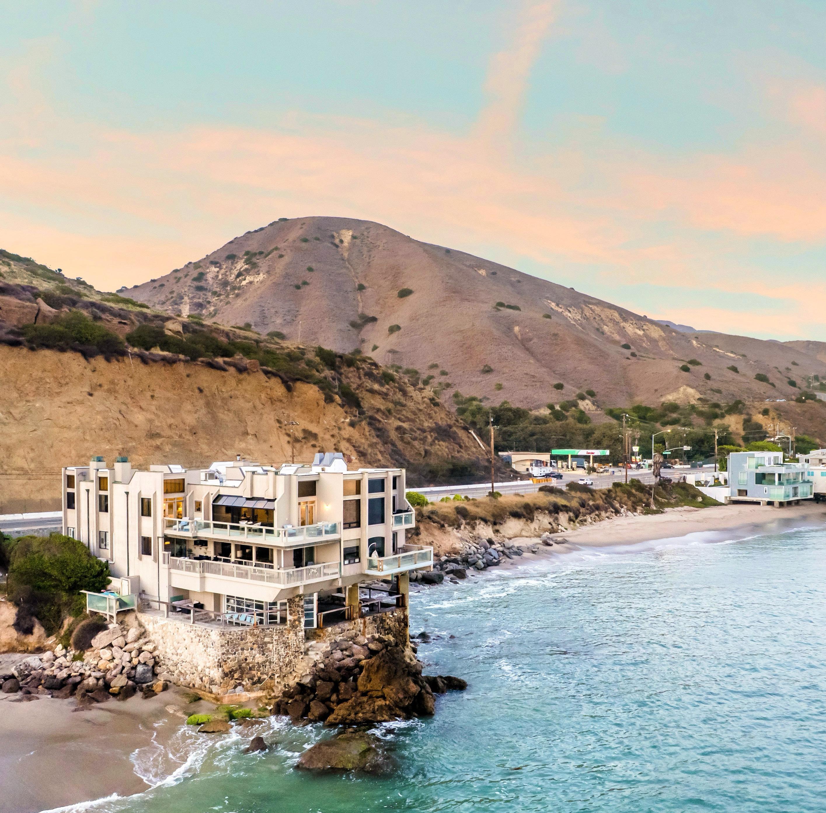Set just north of Corral Canyon on Malibu’s Pacific Coast Highway, this gated beachfront building includes four residences and no neighboring buildings, blending privacy, inventive design, and uninterrupted ocean views along its own uniquely secluded stretch of sand.