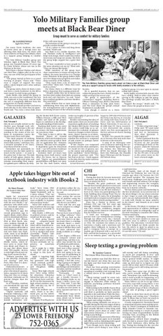 exclusive group, it is now open to anyone within Yolo County. Smith highly recommends anyone who has a sibling, child or other close relative serving in the military to join the group. The meetings usually take place at Black Bear Diner. “Support the troops,” Smith said. “To show [them] the people at home care.” ZANDER WOLD can be reached at city@theaggie.org.