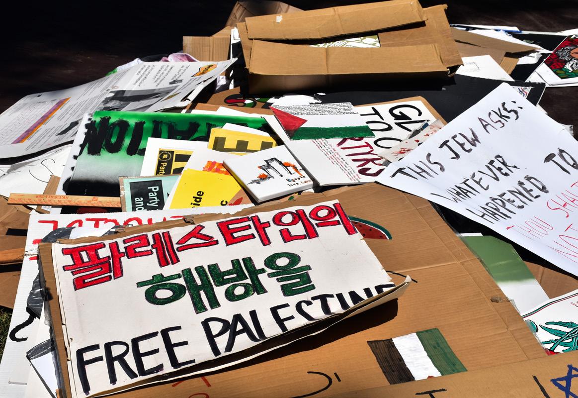 A pile of signs within the encampment, featuring messages in support of Palestine. (Maia Zhu / Aggie)