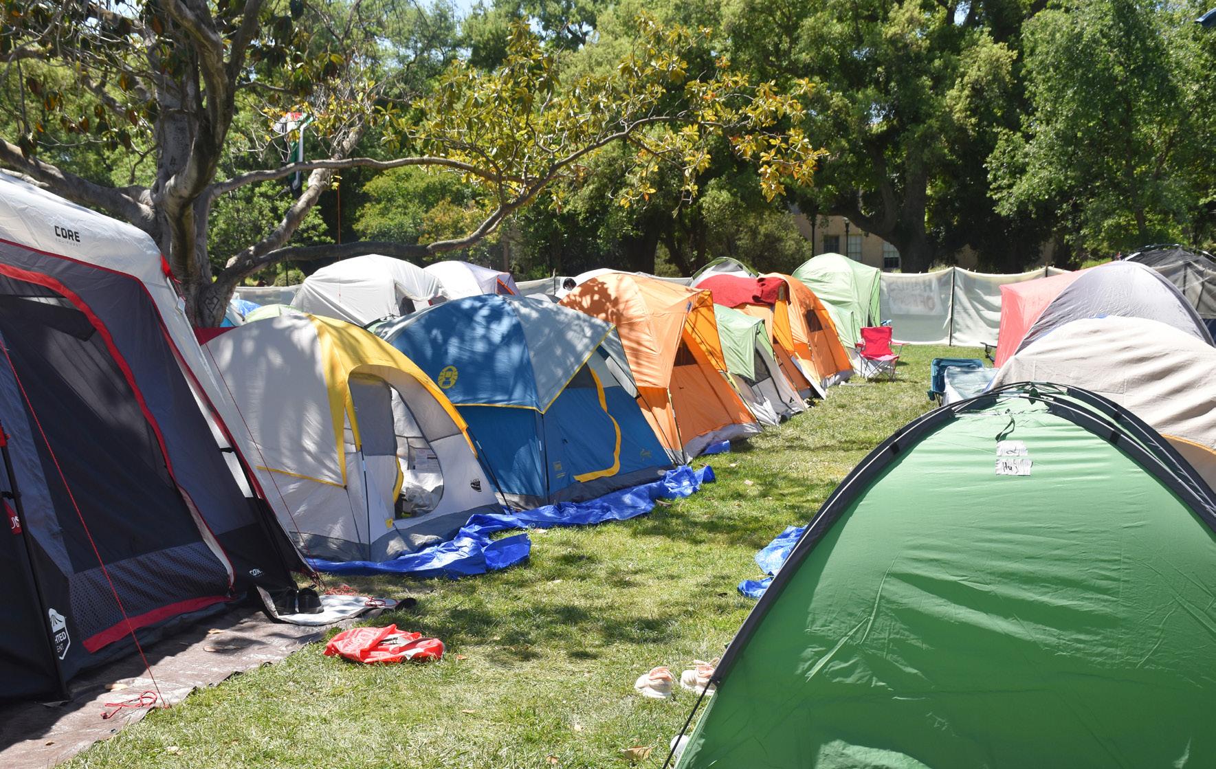 Tents are lined up within the encampment on the Memorial Quad as the protest enters its second week. (Maia Zhu / Aggie)