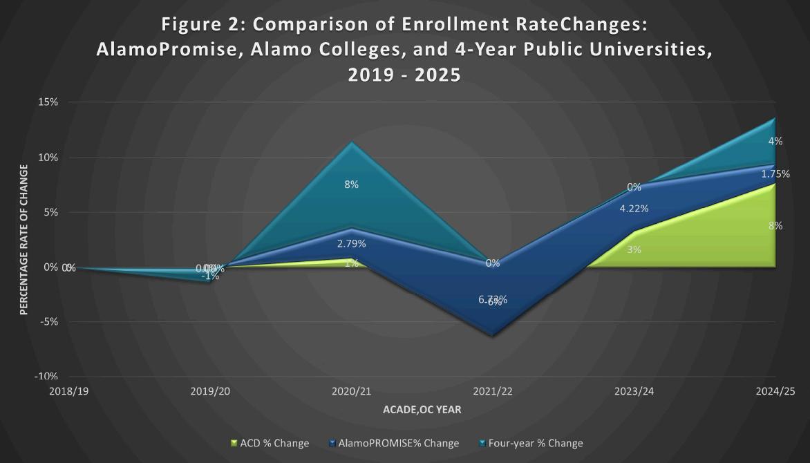 Figure 1 and Figure 2 provide additional context for the enrollment environment. In Figure 1, we can see that ACD accounted for more than 50% of the students enrolled in higher education in San Antonio. This is a consistent feature of the academic landscape for the period from 2019 to 2024. In Figure 2, we see the growth rates, or rates of change, in enrollments during the 2021/2022 –2024/2025 academic years. This perspective of local enrollments brings into stark relief the impact of AlamoPROMISE, in particular, between the 2021-2022 and 2022/2023 academic years, as the district rebounded from COVID, and increases in enrollment exceeded 60%.