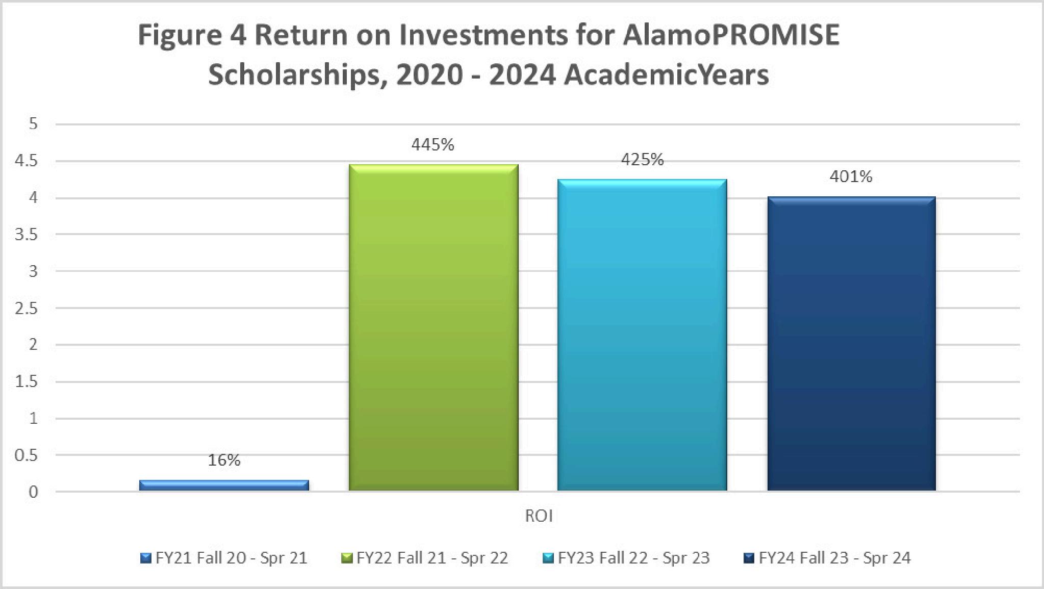 In Figure 4, we see the AlamoPROMISE return on investment (ROI) What does this mean? For every dollar that ACD spent on these scholarships, it received on average $4.22 in additional support to help educate and grow the supply of educated workers in Bexar County. How? Every student is required to complete ApplyTexas and the Free Application for Federal Student Aid (FAFSA) or Texas Application for State Financial Aid (TASFA).