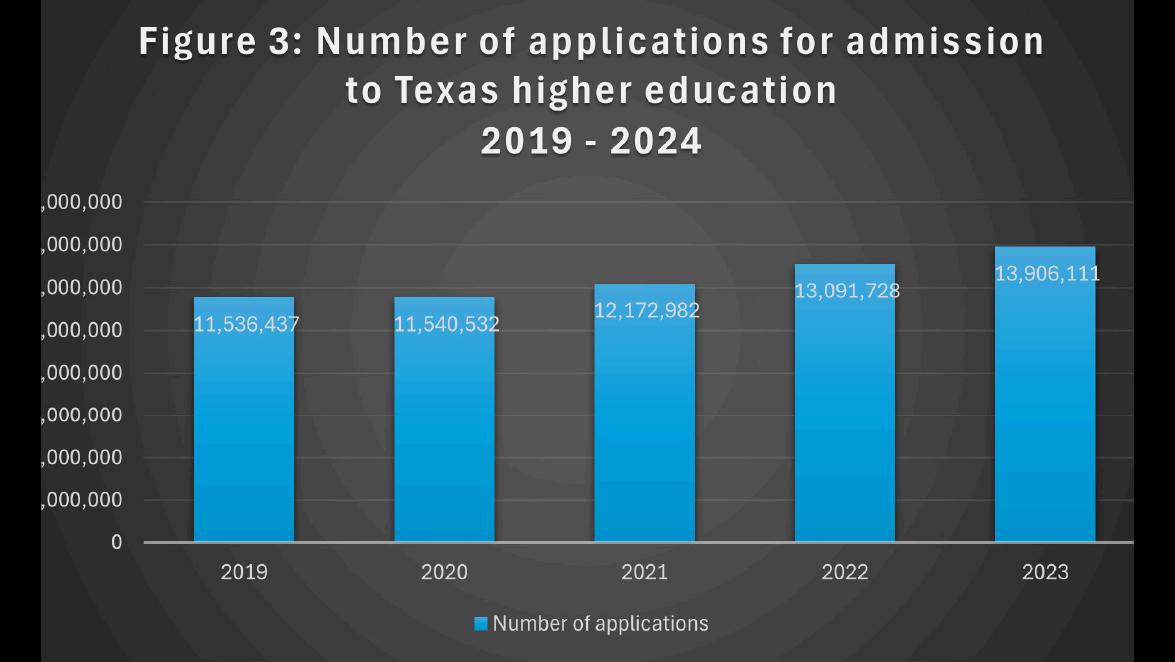 These figures provide a contrast to the single-digit enrollment for the general programs. In Figure 3, we see the general context of applications to attend public colleges and universities in Texas between 2019 and 2023. While the enrollments are growing, they are clearly growing at a slower pace than that experienced in Bexar County through AlamoPROMISE