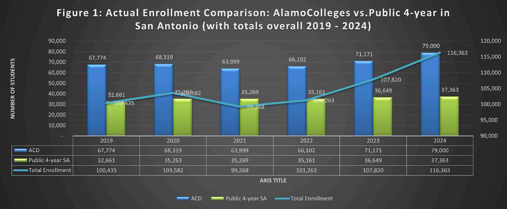As of Fall 2024/Spring 2025, the AlamoPROMISE offered by ACD experiences its 5th year of enrollment, starting with a planning phase in 2018, followed by a launch phase in the 2019/2020 academic year, serving 27 high schools and programs In 2022, the program expanded, adding another 20 high schools and programs At the time of writing, over 23,000 students had enrolled in AlamoPROMISE The 2024/2025 enrollment promises to be the largest cohort yet This process of scaling the AlamoPROMISE program coincided with a growth in overall enrollment such that by 2024, Alamo Colleges enrolled a record 79,000-plus students. The 2024/2025 Promise incoming class numbered 15,598 (Alamo Colleges District, 2025).