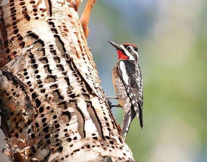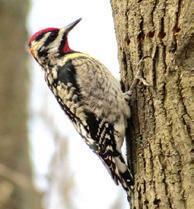 Woodpeckers in general tend to be shy these ones in particular so you may not see the actual perpetrator, but you’ll notice the marks they leave on the world. Yellow-bellied sapsuckers get their name from their coloring (yellowish belly) and their feeding behavior. They bore many small, regularly spaced holes through the top layer of bark in a tree, letting the sap drip down from the holes. Then they lick up the sap as food and return repeatedly to the same tree to eat the insects that get trapped in the sappy holes.