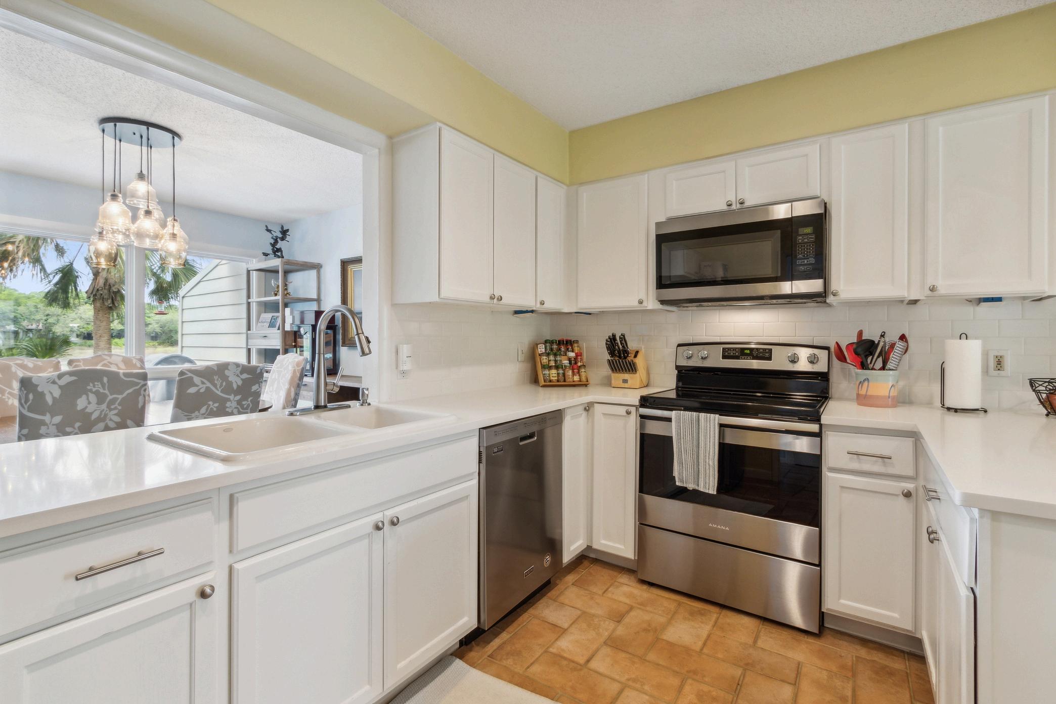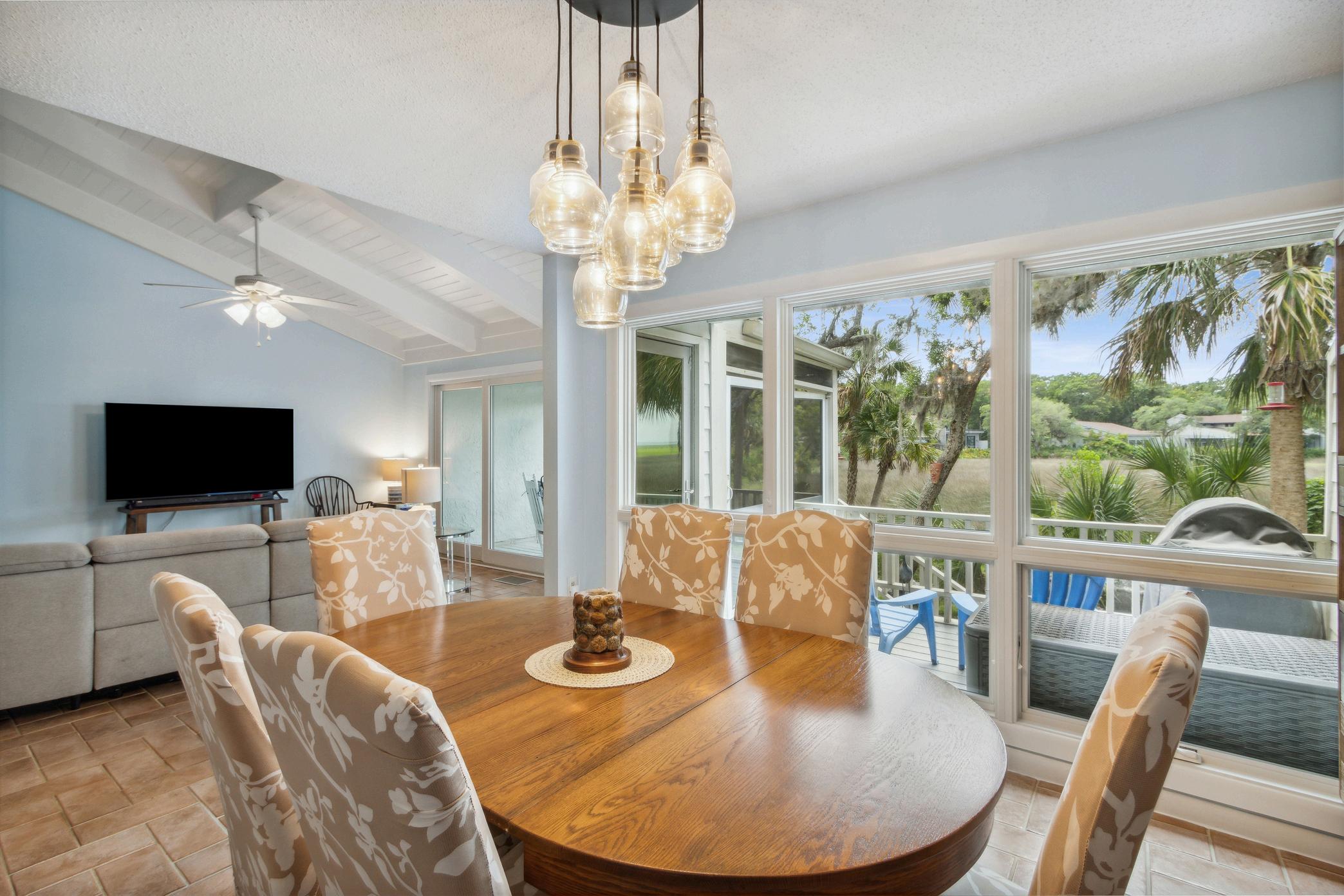 The kitchen has a neutral palette, quartz counters, and a cozy breakfast nook. Downstairs, there is a guest bedroom with a private, front-facing deck, and a full guest bath Upstairs, the primary suite has a renovated bath and private, marsh facing balcony. Located steps from the quiet community pool and just a short golf cart ride to the beach, this villa is the perfect island getaway. The exterior windows and doors were recently replaced HVAC and hot water heater were replaced in 2019