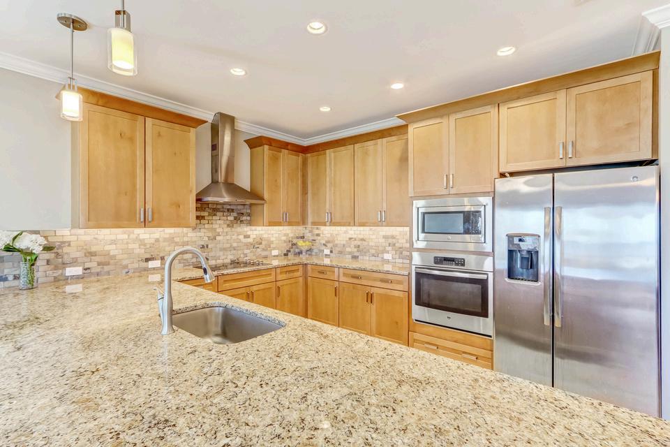 The kitchen includes granite counters, Thermador appliances, and custom wood cabinetry.