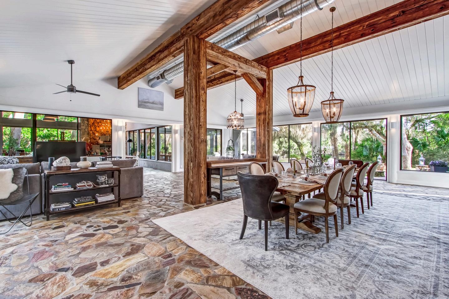 A remarkable great room serves as the heart of the home. It is a space that is both grand and intimate, capable of hosting formal gatherings and relaxed family moments Beautiful stone floors juxtaposed with soaring vaulted ceilings create a striking contrast The wood tongue and groove ceiling is painted white and accented with reclaimed wood beams Two sides of the great room are covered with windows providing panoramic views of Red Maple Lake and the beautiful grounds outside Massive reclaimed wood posts stretch from floor to ceiling and divide the room into distinct areas. The formal dining area of the great room beckons as the quintessential backdrop for hosting extraordinary dinner parties. Dual weathered pendants, suspended from the vaulted ceiling, cast a warm glow over the dining space. Adding to the ambiance is custom built-in cabinetry with lower cabinets painted in a soothing and sophisticated soft grey hue and topped with wood counters. Above, the upper cabinets take on a bold and modern persona, fashioned from custom-welded metal The interplay of wood, metal, and stone sets the stage for an unforgettable dining experience