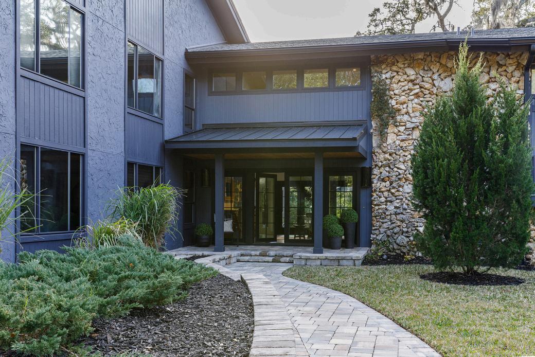 The front entryway was designed to keep the character of the home intact while updating the style to reflect modern trends. A curved paver walkway leads to an inviting covered front porch. The intricatelypatterned pavers, glass windows, and metal roof create a marriage of textures that complement the stone facade. A muted grey color with black accents was chosen as a contemporary backdrop for the front of the home, offering a subtle yet chic canvas for the architectural elements to shine