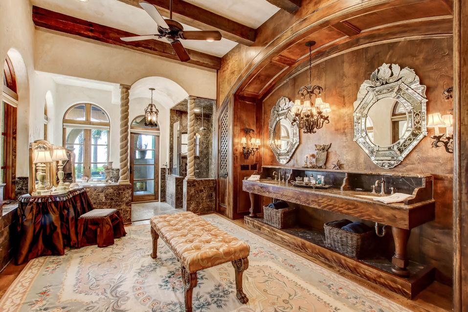 The spacious master suite was extensively remodeled with stunning light fixtures, dual vanities, handpainted wall finishes, a spa-like shower, and his/hers closets