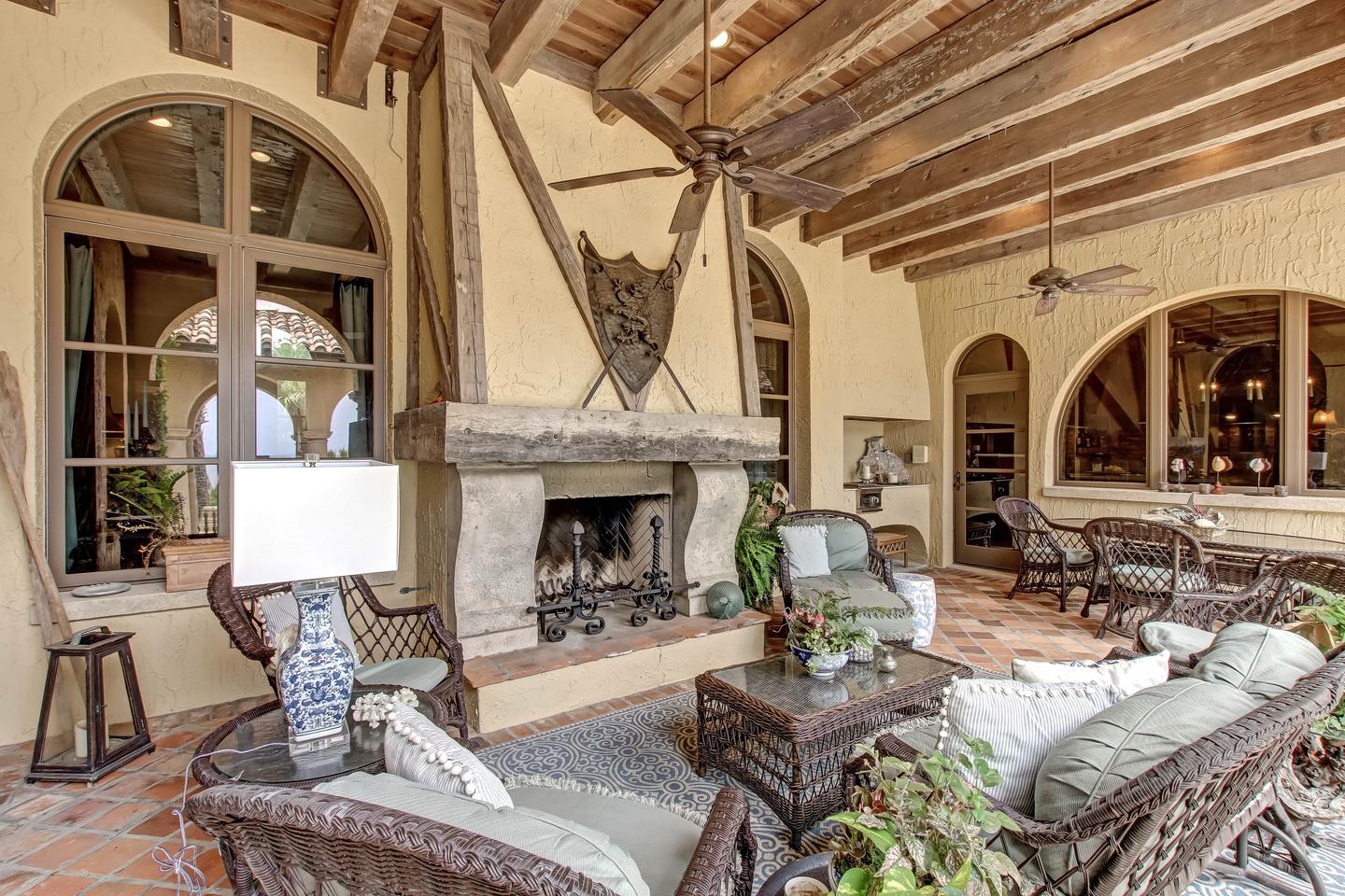 The ocean view from this outdoor living space is framed by an arched colonnade that flows through the terrace. A dipping pool and/or hot tub anchors the space and provides a serene ambiance The loggia includes retractable screens, floor tiles imported from France by Wyatt Childs, and a wood-burning fireplace constructed onsite with giant cast stone corbels.