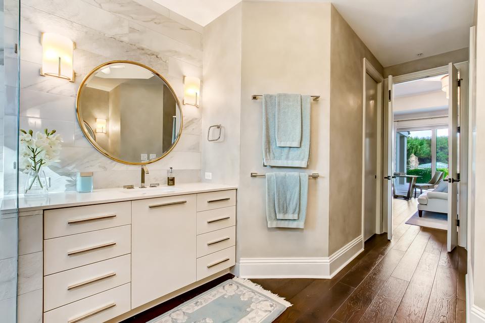 The primary floor (2nd story) was designed to provide all the owner ’ s wants and needs for a convenient, accessible and incomparable style of living The great room flows easily to the kitchen, terrace, and loggia. The great room's focus is centered around gorgeous ocean views and balanced by The Chateauroux fireplace by Thierry Francois The floors are imported French Oak by Wyatt Childs Inc of Atlanta. The walls on the main floor are Venetian plaster or Jacques Rocks by Ann Sacks of Los Angeles.