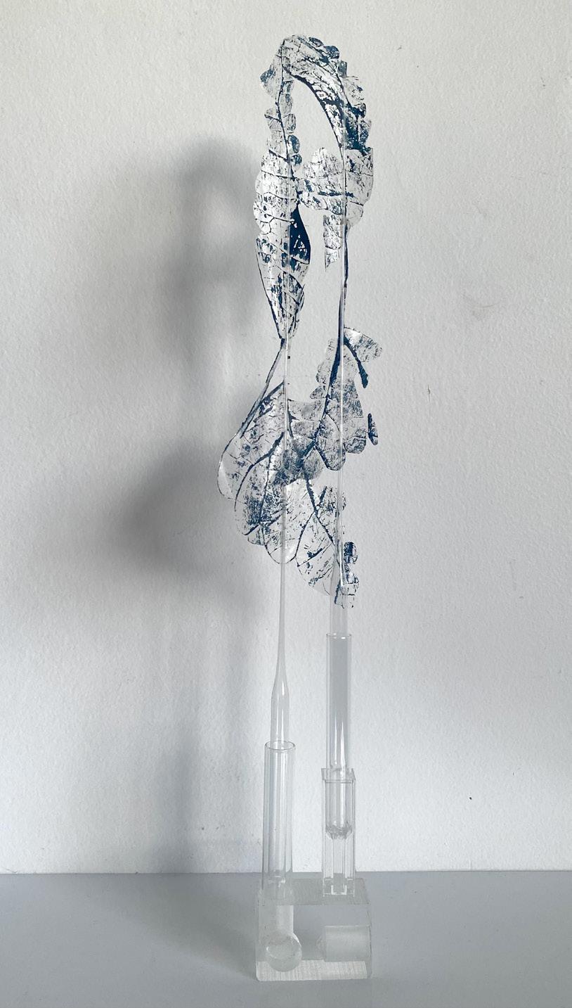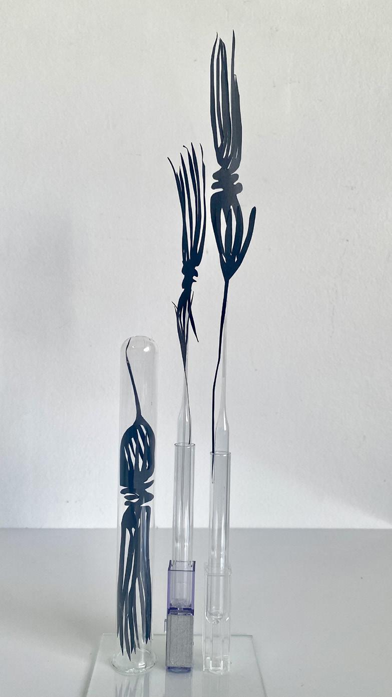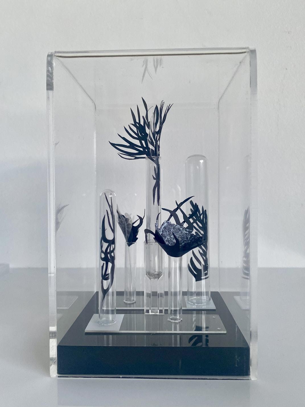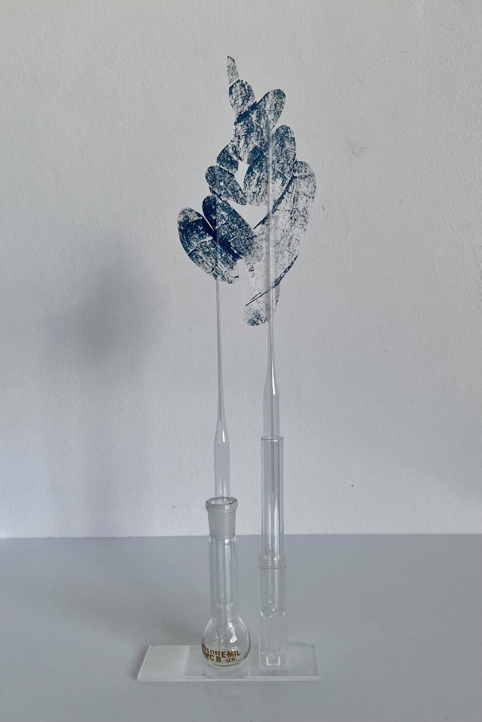 Helen’s conceptual works evolve from her deep joy awe and love of nature and serendipitously, expanded with the acquisition of a clutch of repurposed materials, ideal for relating her responsive curiosities. Further lines of unique gesture and narrative unfolded. Fine paper parings, printmaking, laboratory glassware, materials imbued of fragility and strength, as medium for intricate installation assemblage works. Compositions for drawing subtle contours of correlation, to the innate strength and fragility of the natural world.