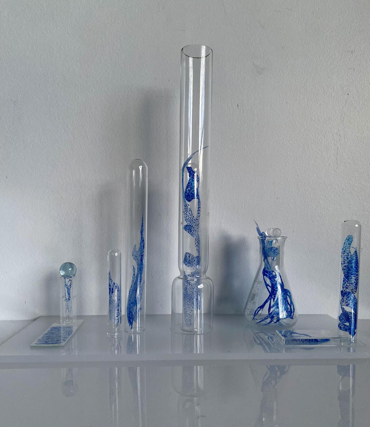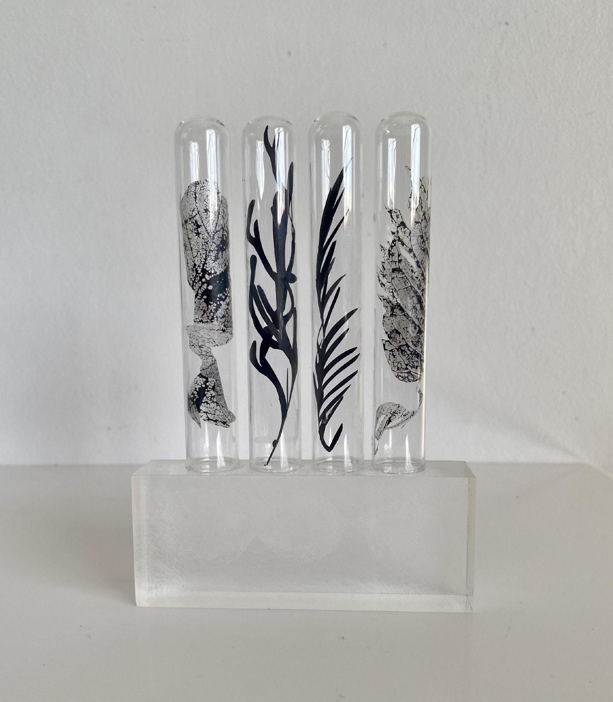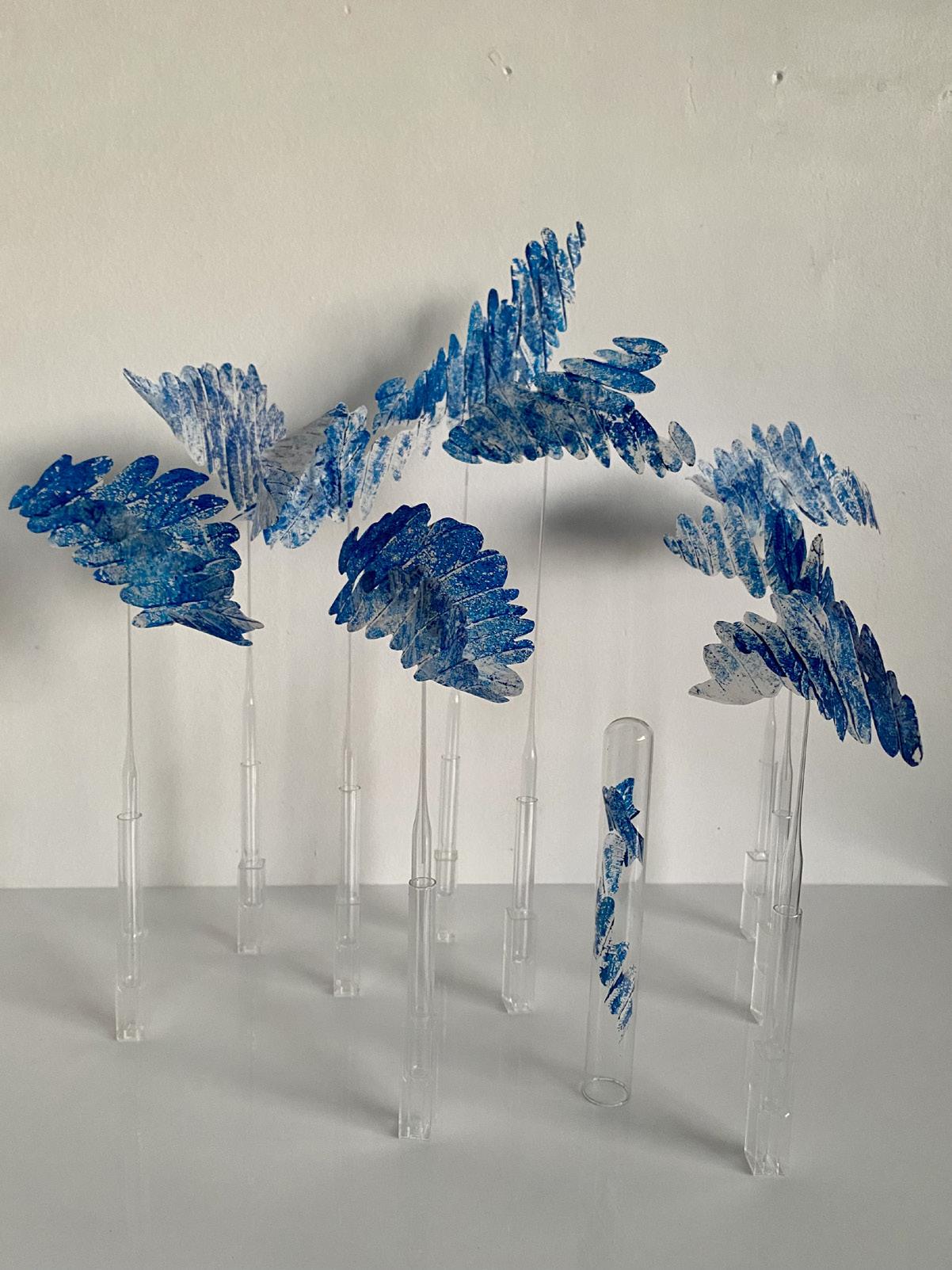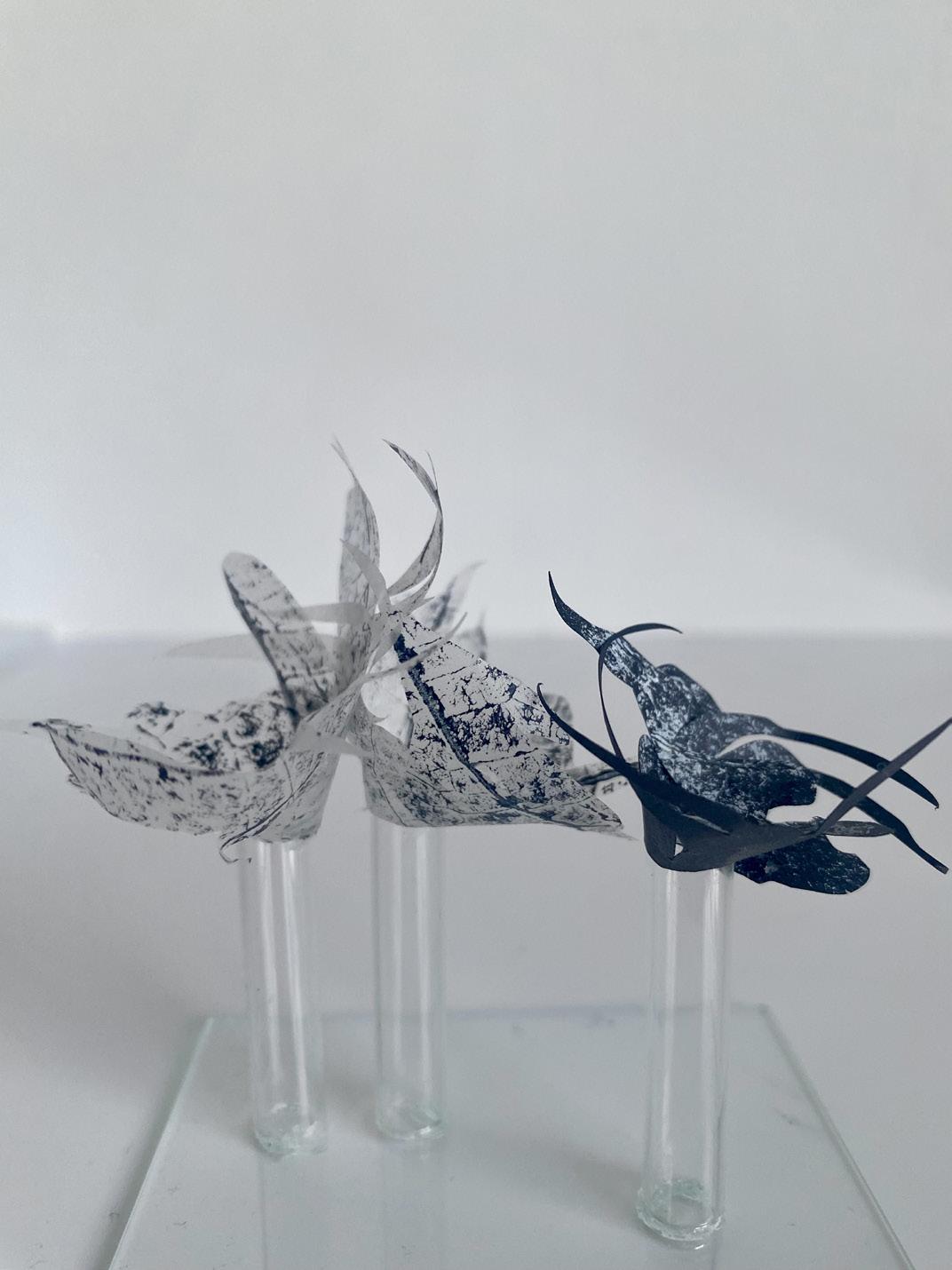 Helen’s conceptual works evolve from her deep joy awe and love of nature and serendipitously, expanded with the acquisition of a clutch of repurposed materials, ideal for relating her responsive curiosities. Further lines of unique gesture and narrative unfolded. Fine paper parings, printmaking, laboratory glassware, materials imbued of fragility and strength, as medium for intricate installation assemblage works. Compositions for drawing subtle contours of correlation, to the innate strength and fragility of the natural world.