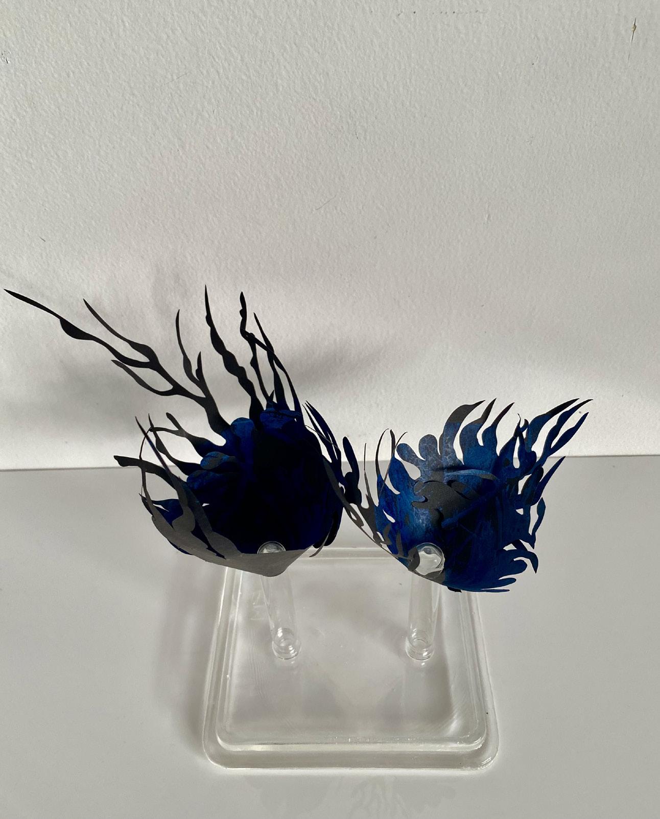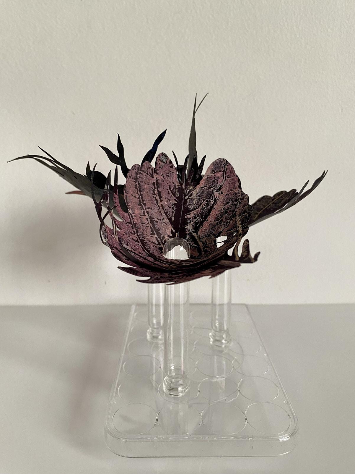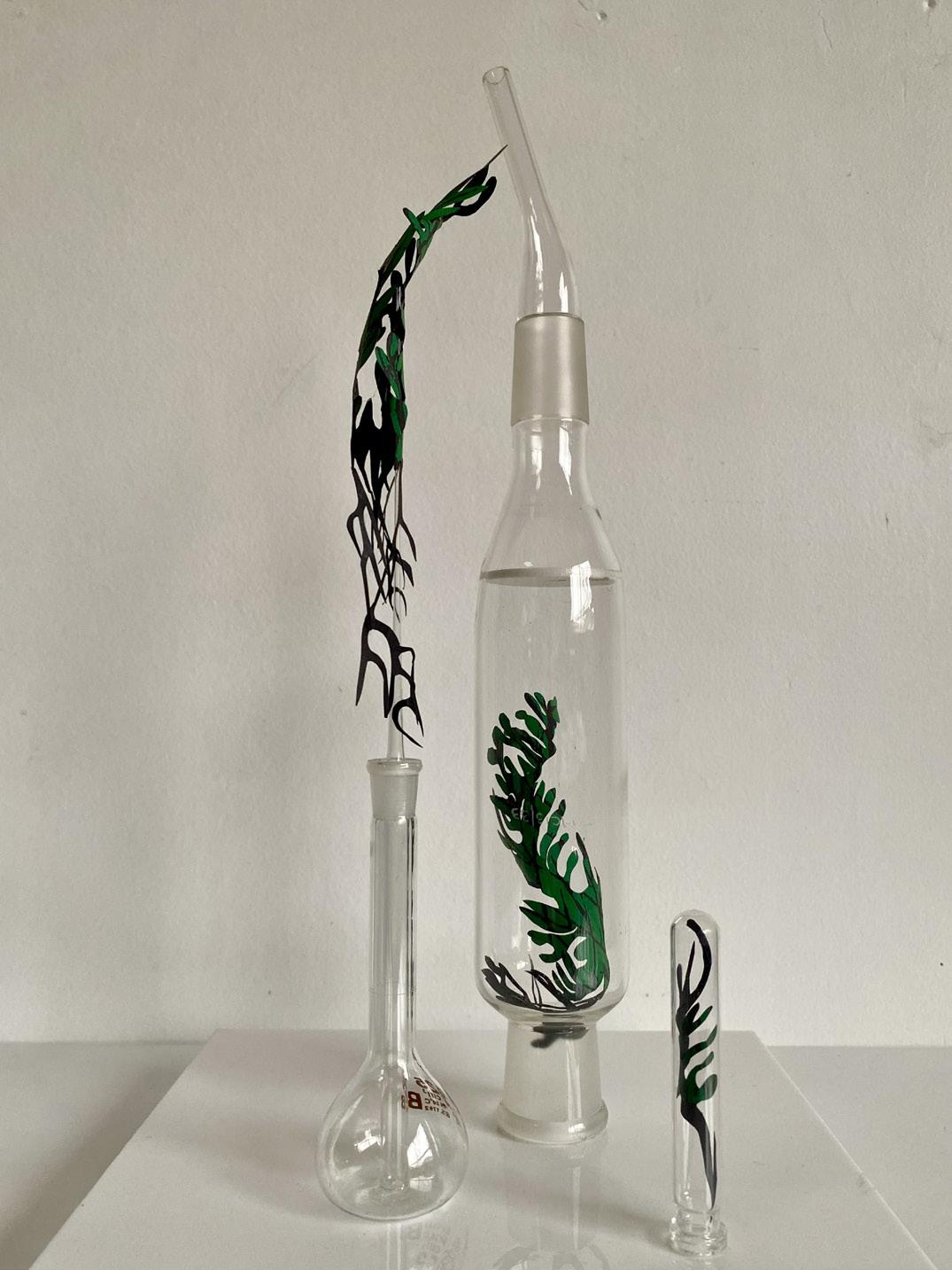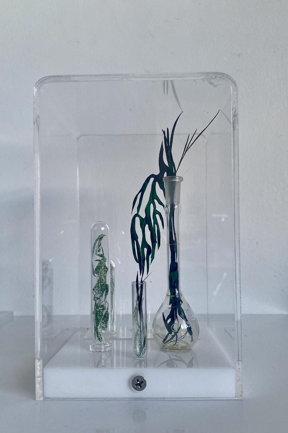 Helen’s conceptual works evolve from her deep joy awe and love of nature and serendipitously, expanded with the acquisition of a clutch of repurposed materials, ideal for relating her responsive curiosities. Further lines of unique gesture and narrative unfolded. Fine paper parings, printmaking, laboratory glassware, materials imbued of fragility and strength, as medium for intricate installation assemblage works. Compositions for drawing subtle contours of correlation, to the innate strength and fragility of the natural world.
