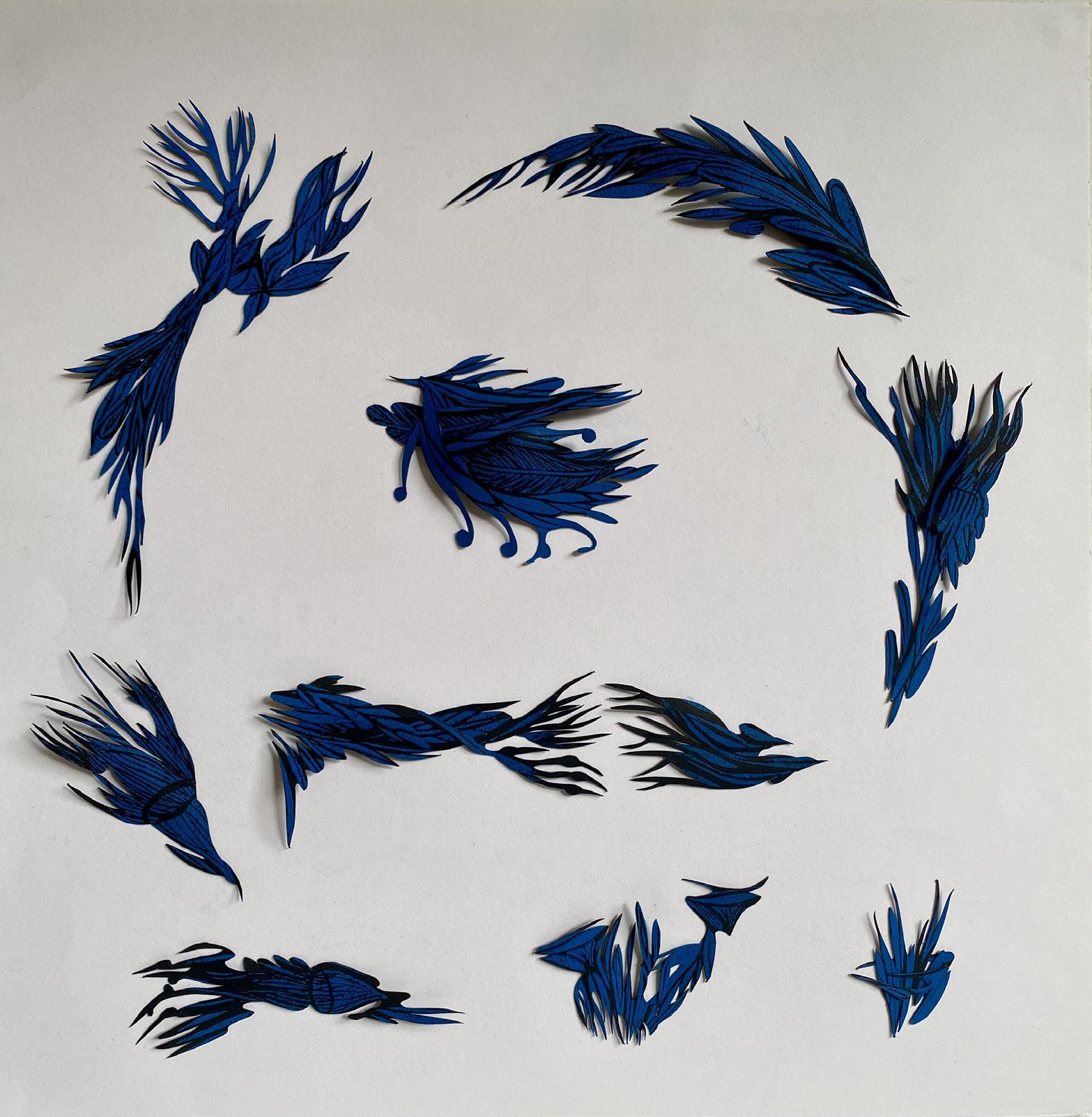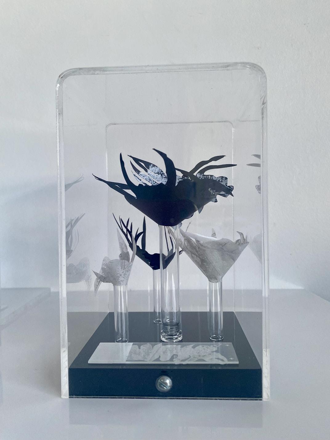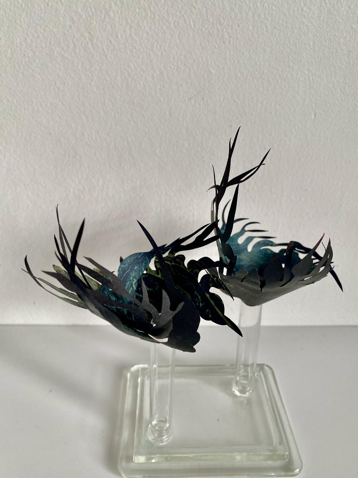 “From towering forests, to fuzzy bread mould, crack sprouted seeds to lush tree fern valleys, microscopic organisms to leaf litter crawl and estuaries of everything, we are not apart. The entwine of the natural world evolves; a cast of shadows and reflections, languages brittle soft flowing still, insistently informing my makings. Ambiguous cuttings of black paper, clear sharp glass, translucent parings. Reflective musings to the clash and caper of nature, where beauty and horror sit side by side, the sinister and the sublime holding embrace within the constancy of change.”