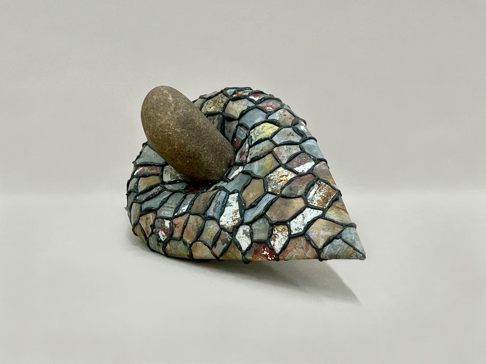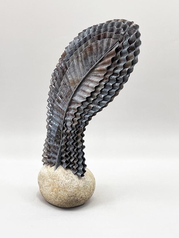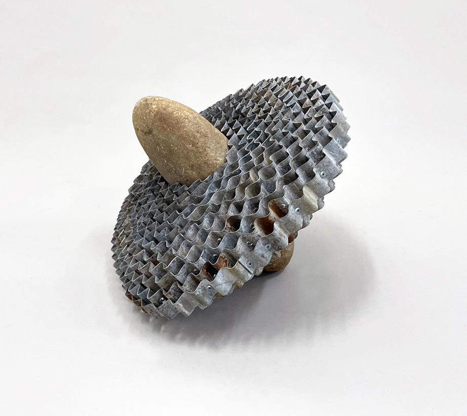 The sculptures engage with deep time, using rocks and recycled materials to examine the relationship between natural and human-made structures. Rocks, shaped over millennia, bear the weight of geological transformation—not only as remnants of deep history but as the very foundations from which life emerged. The minerals within stone gave rise to the earliest forms of life, linking the inert with the living in an unbroken continuum of change. Recycled metals, materials of industry and settlement, carry the marks of human history and decay. By manipulating these elements, I bridge the ancient with the contemporary, highlighting the tensions between endurance and erosion, control and entropy.
