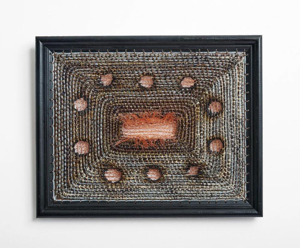Wooden frame, paint, raffia, paper twine, copper wire, varnish