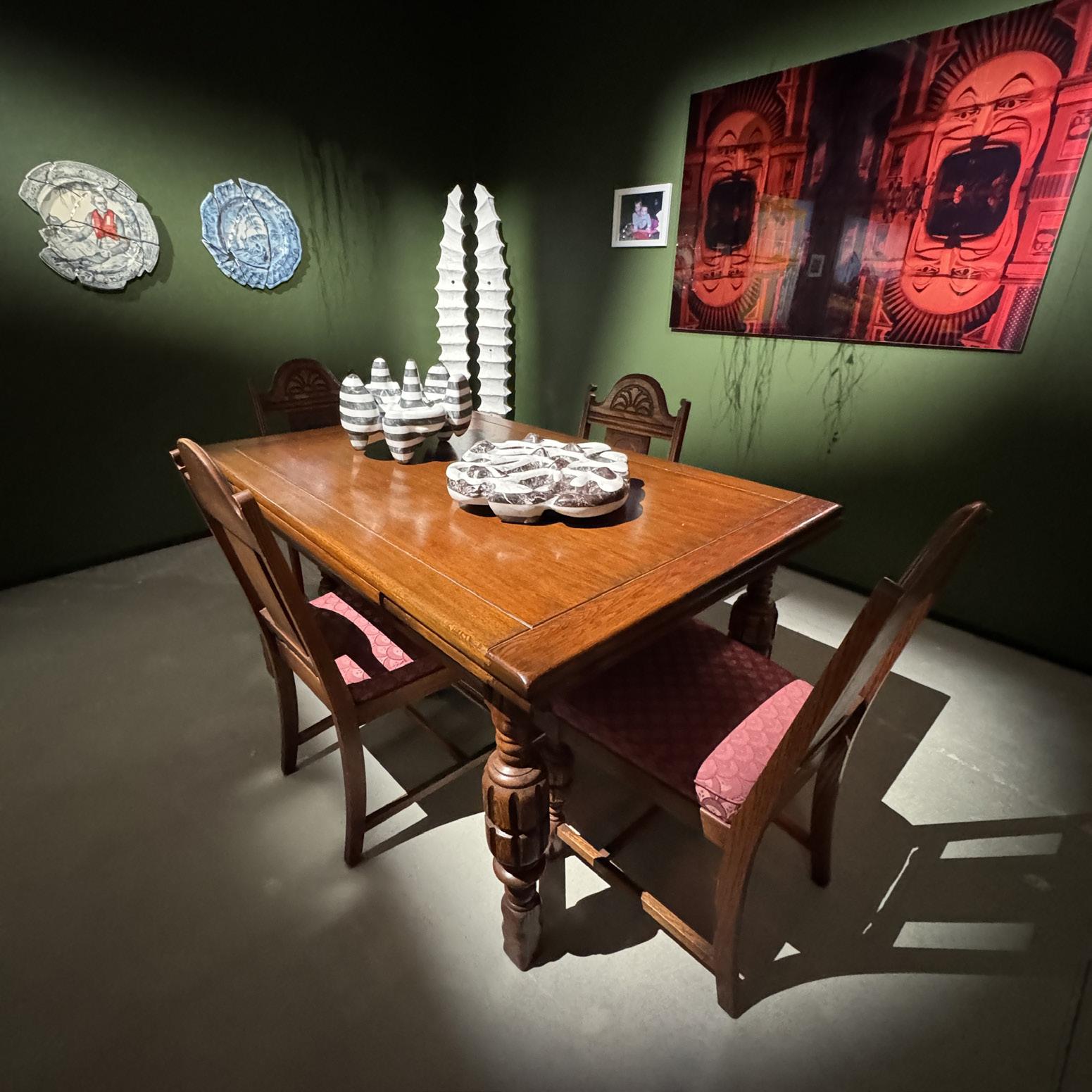 Our Living with Art exhibition extends this idea into the gallery, creating a domestic installation: a place where art sits among family photos, where a dining table becomes a plinth for sculpture, where creativity is woven into the everyday.