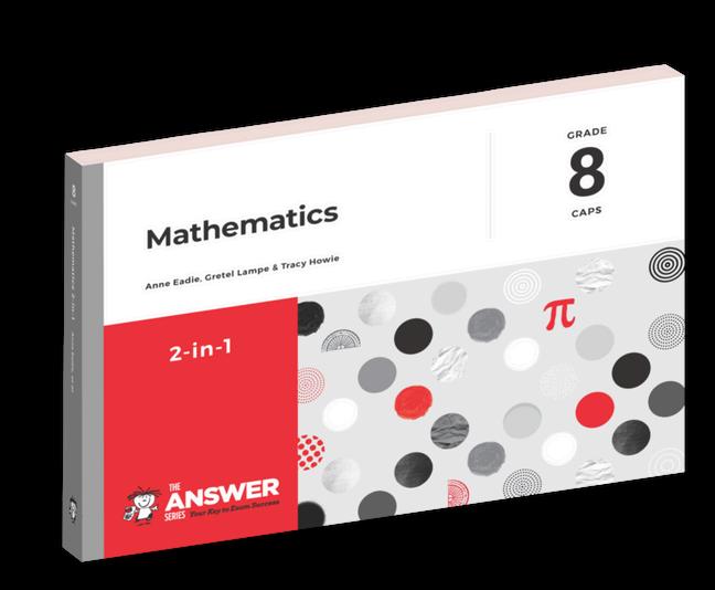 Our Grade 8 and 9 '2-in-1' publications are valuable revision tools offering exercises that are graded in difficulty. They guide learners from practising fundamental concepts all the way through to the more advanced work in manageable steps. Answers with full details and reasonings are provided, allowing learners to selfcorrect and improve along the way. This ensures a thorough understanding of theory and concepts, and helps learners practice their mathematical techniques independently. Exam papers with full, detailed solutions are included.