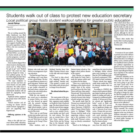 Roberts, who took issue with DeVos’s encouragement of private education. “I’m here because I have several siblings, and I want them to have a good future. The key to a good future in America is a good education,” Roberts said. “I can tell there is a strong push to gut (public education) to the point where a private education is the only useful education we have access to.” While the vast majority of the crowd was in attendance to protest DeVos, not everyone who showed up agreed with the protest’s message. Caleb Christensen, a Borah High School student, took issue with perceived anti-Trump mood of the event. “This is just an anti-Trump protest; just another way to say, ‘We don’t like you and we want you out.’ We’re here to say that students are for Trump,” Christensen said. Other students, such as