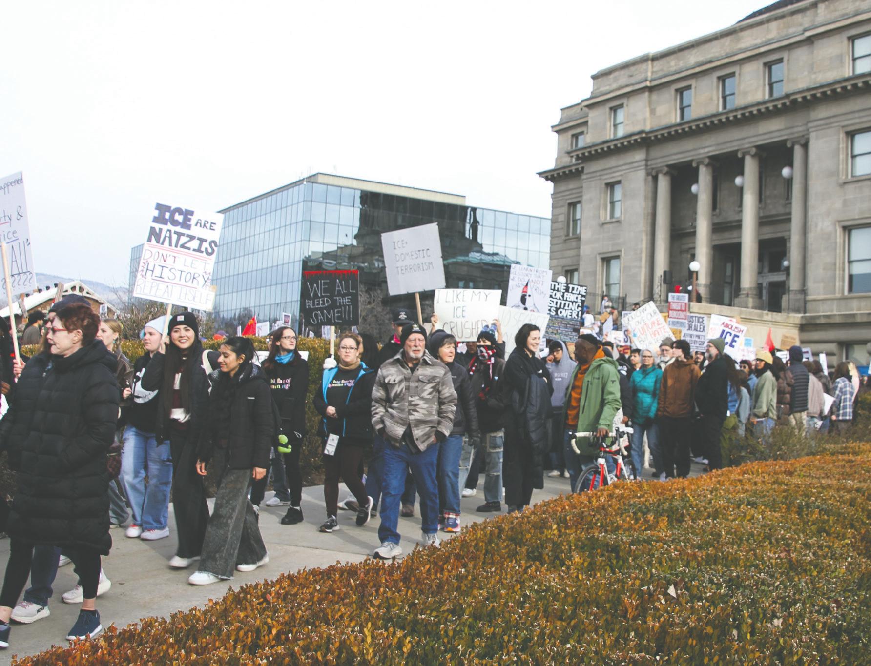 Car horns honked enthusiastically as protestors gathered Friday afternoon on the lawn and steps of the Idaho Capitol, joining the nationwide ICE OUT movement to protest the administration’s immigration enforcement practices and the recent deaths linked to violence at the hands of federal agents in Minnesota.