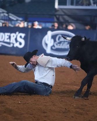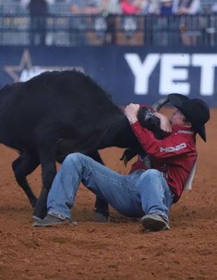 Competing in such a talented pool of bulldoggers and friends—Matt Reeves has won more than $500,000 in his appearances at the event, and Tyler Waguespack is a five-time world champion—J.D. knew he had to treat his run like business as usual. He was familiar with the pen of steers and took his time getting his steer to lay over after gliding off Crush —all in a mere 4.6 seconds. Having his two young daughters there watching also gave J.D. a boost of confidence. He won money at Rodeo Houston, San Antonio, and the Dixie National Rodeo this winter, putting him in 12th place in the world standings and on track for what he hopes will be his sixth WNFR qualification.