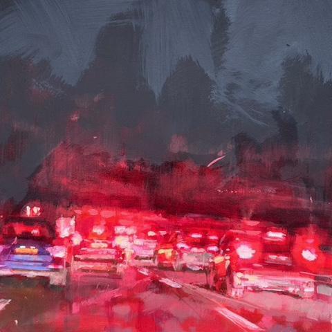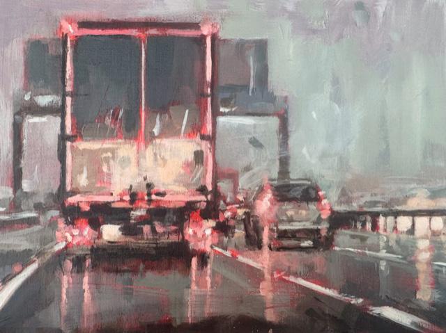 Louise’s paintings focus on the charged but often overlooked moments within urban life, particularly those found in “dead time” such as commuting, idling at junctions or navigating traffic. In these suspended