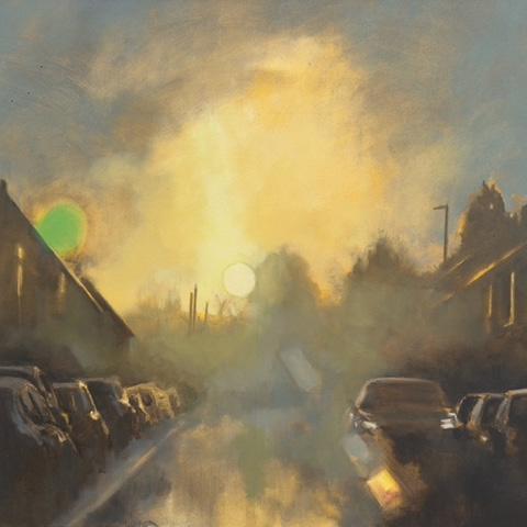 Louise’s paintings are grounded in observation yet deeply atmospheric. She often begins with familiar, unremarkable places such as suburban streets, junctions, and the edges of car parks. Her interest lies not in documenting them but in capturing the elusive moment when light transforms the ordinary into something almost cinematic. “I’m drawn to the way light alters what we think we see,” she once said. “It turns the everyday into something momentary and fleeting.” Her surfaces balance clarity and dissolution, a car half-absorbed by mist or a street disappearing into the glare of a setting sun, and this play between control and surrender gives her paintings their quiet tension.