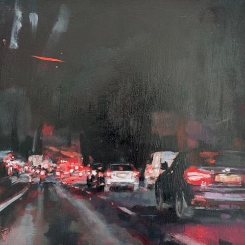 instants she notices shifts in light, movement, colour and mood, and transforms them into atmospheric townscapes. Her process is intuitive and physical, working in oils to build and scrape back layers, allowing the image to settle gradually between realism and abstraction.