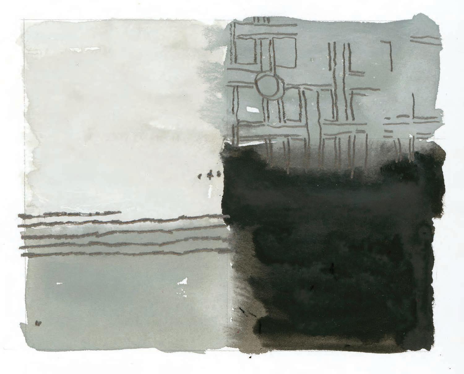 “I distress and repair parts of the painting, as we do within ourselves. The drawings of floor plans and elevations, which I use as a starting point, create a sense of enclosure, which I expand by continuing the lines outward, breaking the structural pattern. This alters the sense of confinement, breaking away from the [rigid, static] norm”.
