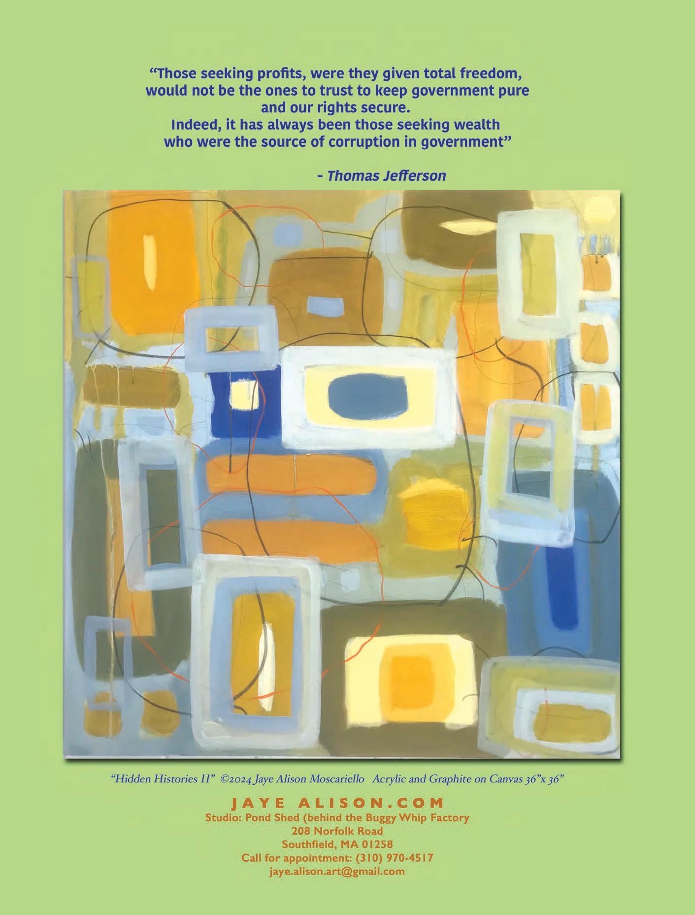 Jaye Alison MoscarielloStudio Visits - By Appointment Only: Pond Shed (behind the Buggy Whip Factory), 208 Norfolk Road, Southfield, Massachusetts. 310-970-4517, jayealison.com, jaye.alison.art@gmail.com
