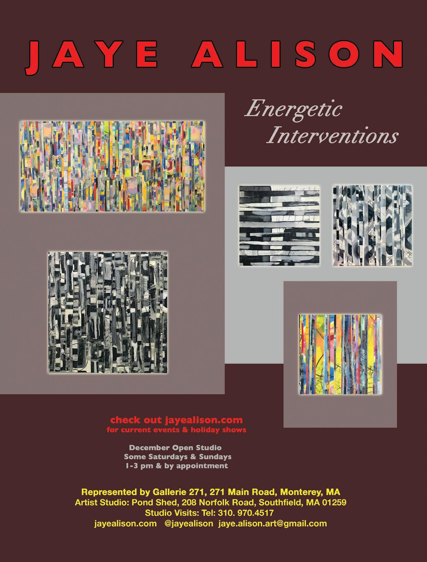 Studio visits by appointment only: Pond Shed (behind the Buggy Whip Factory) 208 Norfolk Road, Southfield, Massachusetts jayealison.com jaye.alison.art@gmail.com