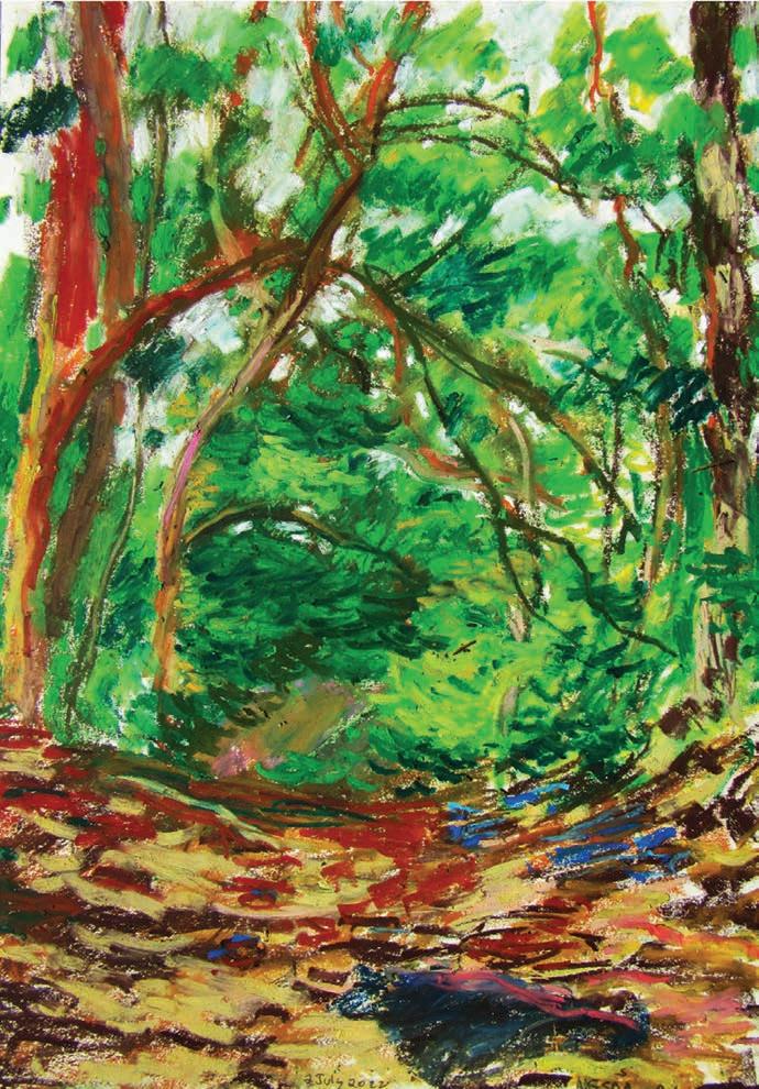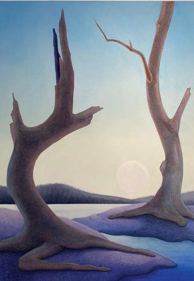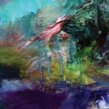 This is one of my Abstract Realism oil paintings focusing on shape with an emphasis on color. The contrast between the pink sky and the green/purple of nature emphasized for me the nakedness of this young tree. The little windows of sky manage to release the tension of form and color.