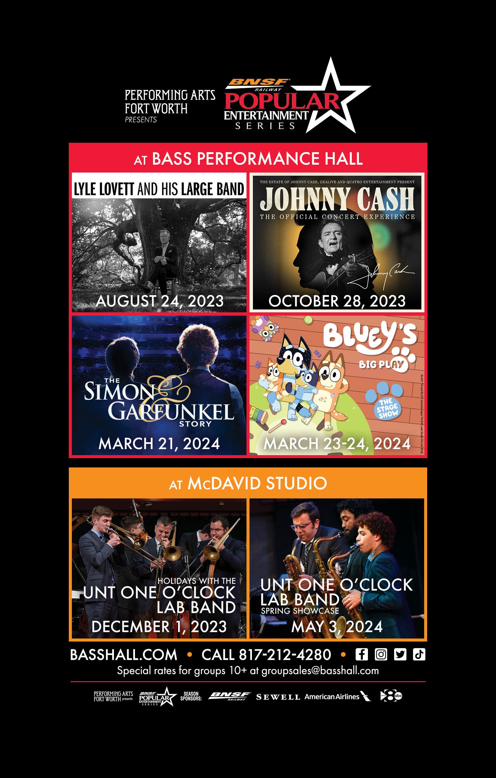 Next up at the Hall, Lyle Lovett and his Large Band return on August 24 as the first show in our 2023-2024 BNSF Popular Entertainment Series. Continuing our 2023-2024 Broadway at the Bass Season presented by PNC Bank , September brings the new show you oughta know, Alanis Morissette’s Jagged Little Pill, followed by the new play from Aaron Sorkin, Harper Lee’s To Kill A Mockingbird. Visit basshall.com for more show information and a full list of all the shows currently on sale.
