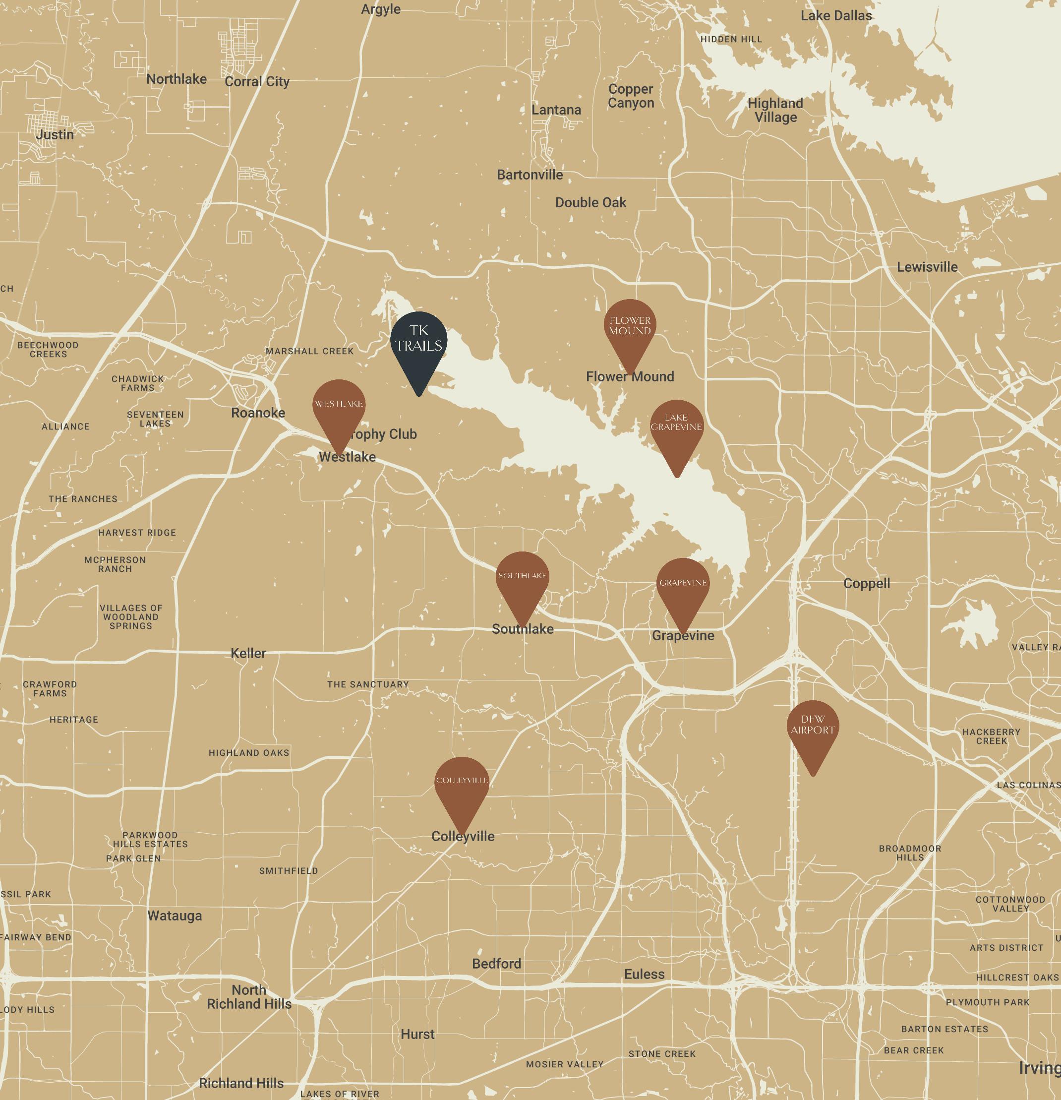 Just 13 miles from DFW International Airport, 5.5 miles from Southlake Town Square, and 5 miles from the exclusive Vaquero Club, TK Trails is more than a property; it’s a once-in-ageneration offering that cannot be recreated a private sanctuary destined to be treasured for years to come