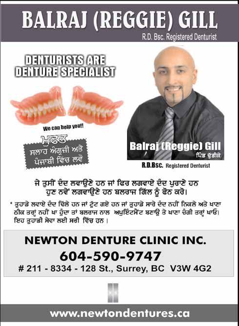 # 103 - 12030 - 80 Ave, Surrey 604-595-8888 RA JDEEP SINGH SEKHON B.A. (Hons.), M.A.LL.B. 778-320-5359 PREC SRS PANORAMA REALTY kI qusIN Awpxw Gr KrIdx jW vycx bwry soc rhy ho! th #104 – 7110 120 Street Surrey, BC V3W 3M8 Ph: 604-503-3853 Fx:604-503-3854 HARINDER DAIL Notary Public, M.A (ALS) M.B.A. B.Sc Professional Serv ices Provided • Estate Planning • Will Preparation • Legal Documents • Power of Attorney • Affidavits • Notarization • Real Estate Purchase or Sale of Property • Trave Documents Honesty - Integrity - Trust HARINDER DAIL Notary Public, M.A. (ALS) M.B.A. B.Sc GrW dI KrIdo ProKq AYstyt plYyinMg vsIAqnwmw numwieMdgI smJOqw kwnUMUnI shwieqw ieMmIgrySn kmrSIAl lIz ibzns ienkwrporySn kwrporyt sMBwl ibzns dI KrIdo ProKq PYmlI lwA spWsriSp lYtr nOtrI syvwvW muKiqAwrnwmw ijld: 20 AMk 44 - THURSDAY, DECEMBER 24, 2022 PUNJABI STAR ravi@theasianstar.com Tel: 604-591-5423 hr qrWH dIAW Cell: 778-895-7444 Fax: 1-800-732-0519 Email: icc.accounting@yahoo.ca Web: www.iccaccounting.com 8740 - 140A St., Surrey, BC V3W 0M4 kMipaUtr rwhIN T`gIAW mwrn dw AMqrrwStrI groh bynkwb kMvr gryvwl Aqy rxjIq bwvw dy GrW ‘qy ienkm tYks dy Cwpy Baljit Singh 778 861 0324 #285 - 8128, 128 St. Surrey, BC V3W 1R1 Send Money Instantly Worldwide AsIN XUAYs fwlr / XUro Aqy pONf vI KrIddy qy vycdy hW duinAw dy iksy vI kony iv`c pYsy Byjx jW mMgvwaux leI imlo Daljit Singh 778 822 8410 #2A - 2599, Cedar Park Pl. Abbotsford, BC V2T 3S4 iSkwr krn leI vrqIAW jwx vwlIAW ku`J Kqrnwk gMnz ƒ htwauxw zrUrI