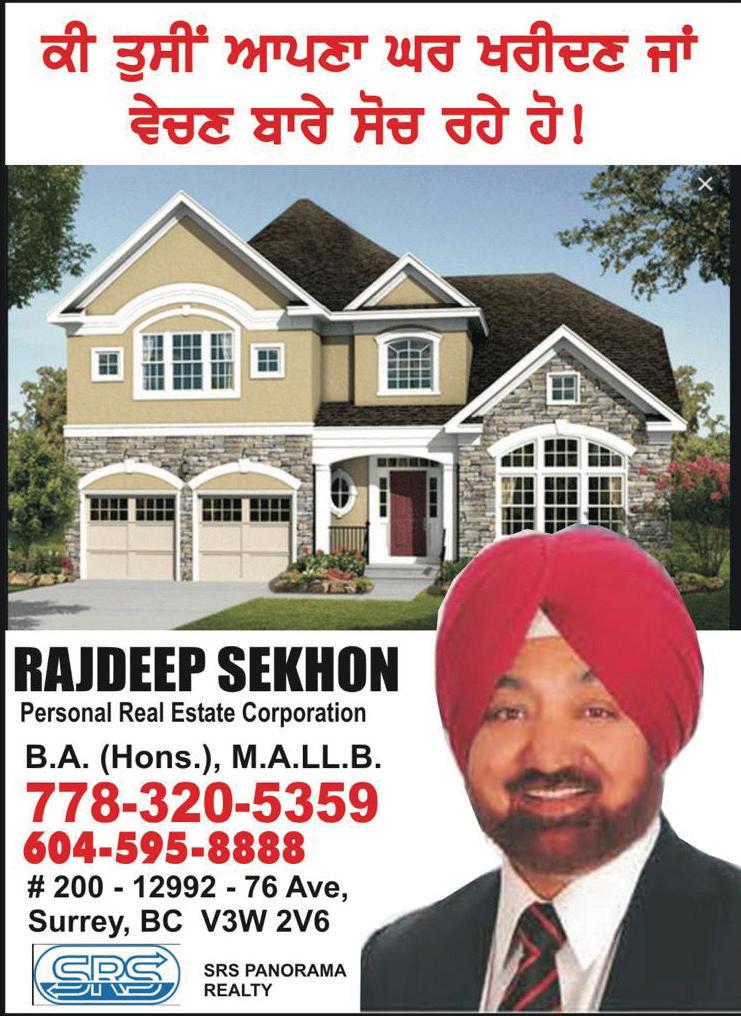 SATURDAY - MAY 04, 2024 3 778-861-2644 gurprIq isMG ig`l Gurpreet Singh Gill Insurance Advisor (B.A.L.L.B.) Life Insurance Disability Insurance Critical Insurance iksy vI qrWH dI lwieP, ifsAYibltI jW ikRtIkl ieMSorYS leI A`j hI kwl kro supr vIzw Aqy iviztr ieMSorYNs SUPER VISA & VISITOR INSURANCE Unit# 215 7928 128th Street, Surrey, BC (York Business Centre) A to Z Insurance Services Inc. Email: insurancebygill@gmail.com Jeet Singh (jIq isMG) mOrtgyj qurMq mnzUr krvwE QUICK MORTGAGE APPROVAL BANK MORTGAGE Low Rates and Cash Back PRIVATE MORTGAGE Instant Approval SECOND MORTGAGE 5-Day Funding CREDIT LINE bYNk mOrtgyj G~t drW Aqy kYS bYk in~jI igrvInwmw qurMq pRvwngI dUjw igrvInwmw 5-idn PMifMg kRYift lweIn 778-320-9494 www.crownfunding.ca