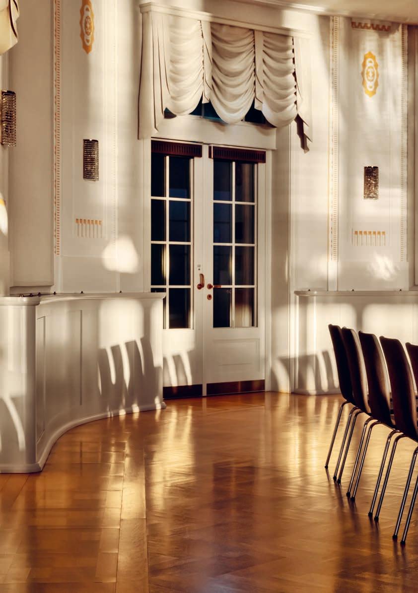 Im Festsaal variieren die Bestuhlungs arten. Wählen Sie bitte einen Platz im Parkett bis ca. 4 Meter Abstand von den Wänden.