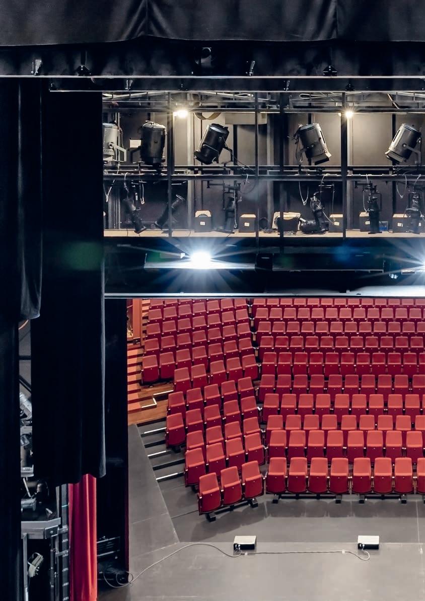 Klare Formen bestimmen die mo derne Architektur des Theatersaals, der sich im Erweiterungsbau des Theater Casino Zug befindet. Der berühmte rote Theatervorhang bestimmt hier auch die Farbgebung des Publikumsbereichs und versetzt die Besucher:innen in die richtige Stimmung für den Kulturgenuss. In der letzten Saison feierte der Saal sein 40-jähriges Jubiläum und durfte in dieser Zeit klassischen Bal letttänzer:innen, Schauspielstars, Jazzgrössen und sogar Weltklasse boxern eine Bühne bieten.